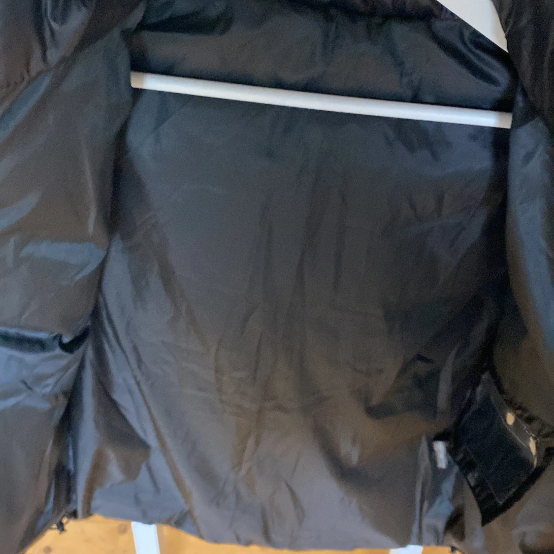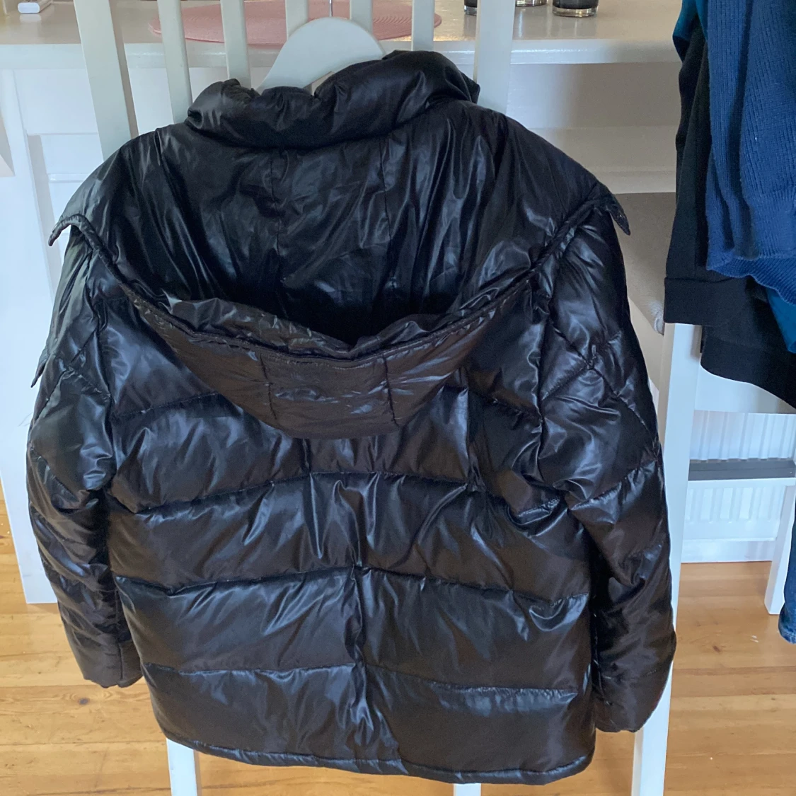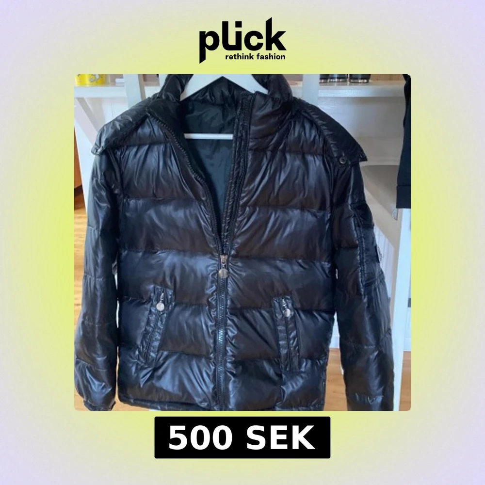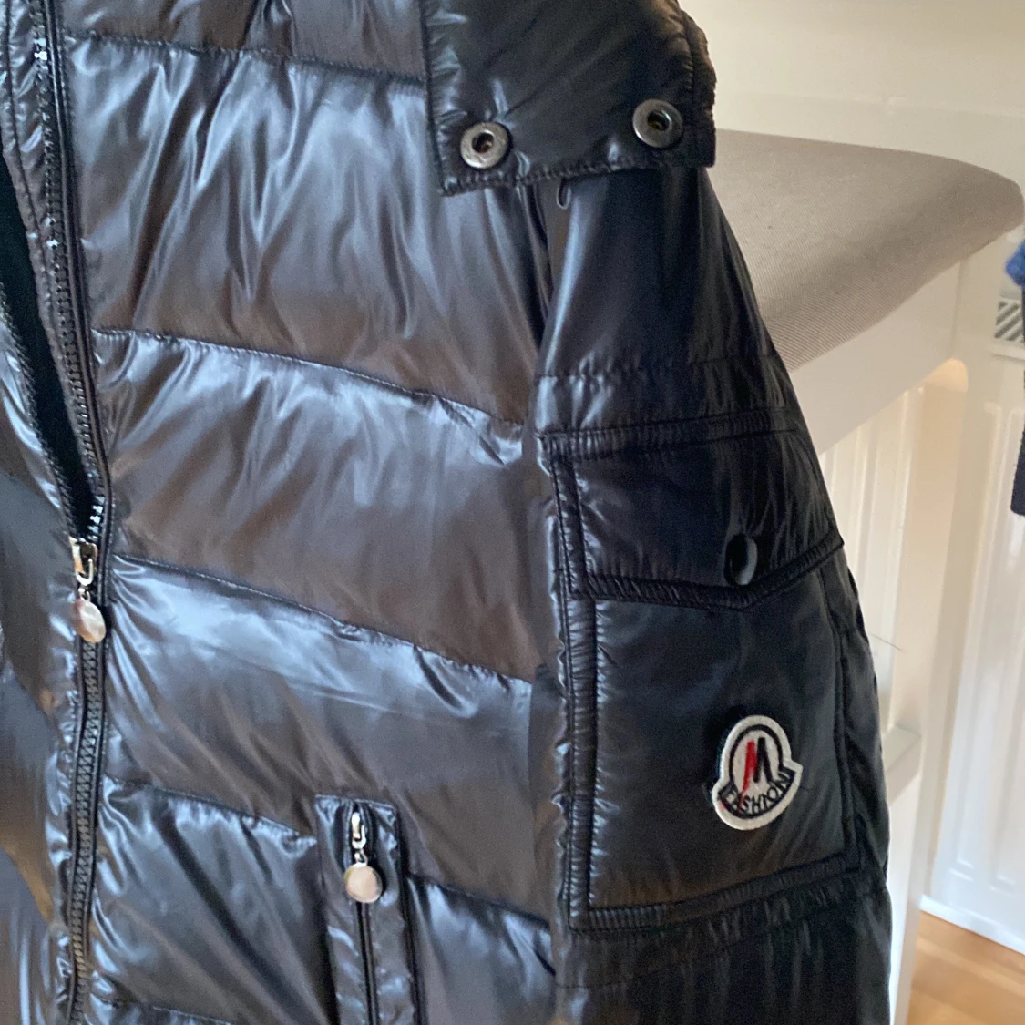 Säljer en svart pufferjacka från Moncler med glansig finish och klassisk logga på ärmen. Jackan har huva, dragkedja framtill och två fickor med dragkedja. Perfekt för kalla dagar när du vill vara både varm och snygg.