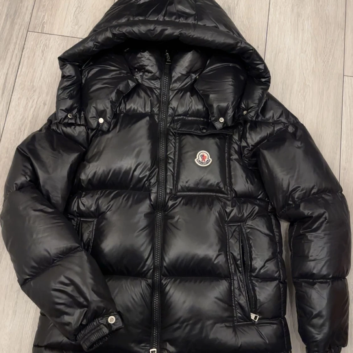 Säljer en snygg svart pufferjacka från Moncler med huva och dragkedja. Jackan har ett stilrent Moncler-märke på bröstet och praktiska fickor. Perfekt för kyliga dagar när du vill hålla stilen. Det finns ett litet hål vid vänster armlängds men det är inget som påverkar funktionen 🖤 bilden kan skickas om så önskans