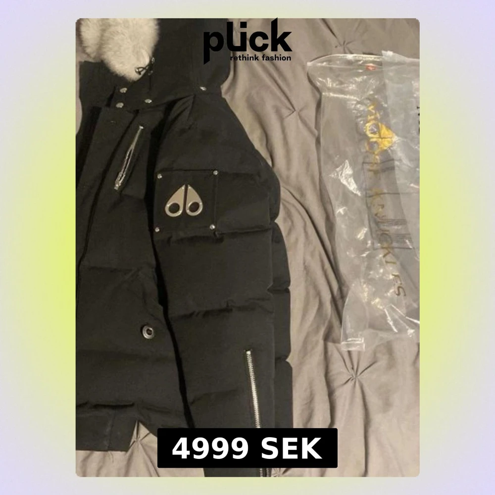 Säljer en svart pufferjacka från Moose Knuckles med fet vit päls på huvan och coola metalldetaljer. Jackan har dragkedjor på ärmar och bröst, samt knappar framtill. Loggan sitter på ärmen och jackan har en schysst oversized look.