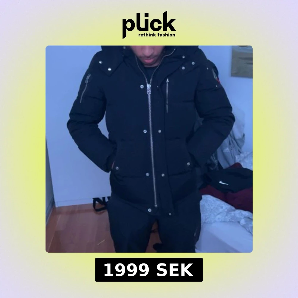 Säljer en svart pufferjacka från Moose Knuckles med ikonisk logga på ärmen, silverfärgade detaljer och dragkedja framtill. Jackan har huva, flera fickor och en riktigt clean look som passar perfekt när det är kallt ute.