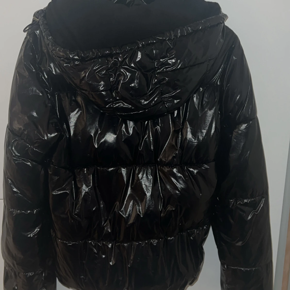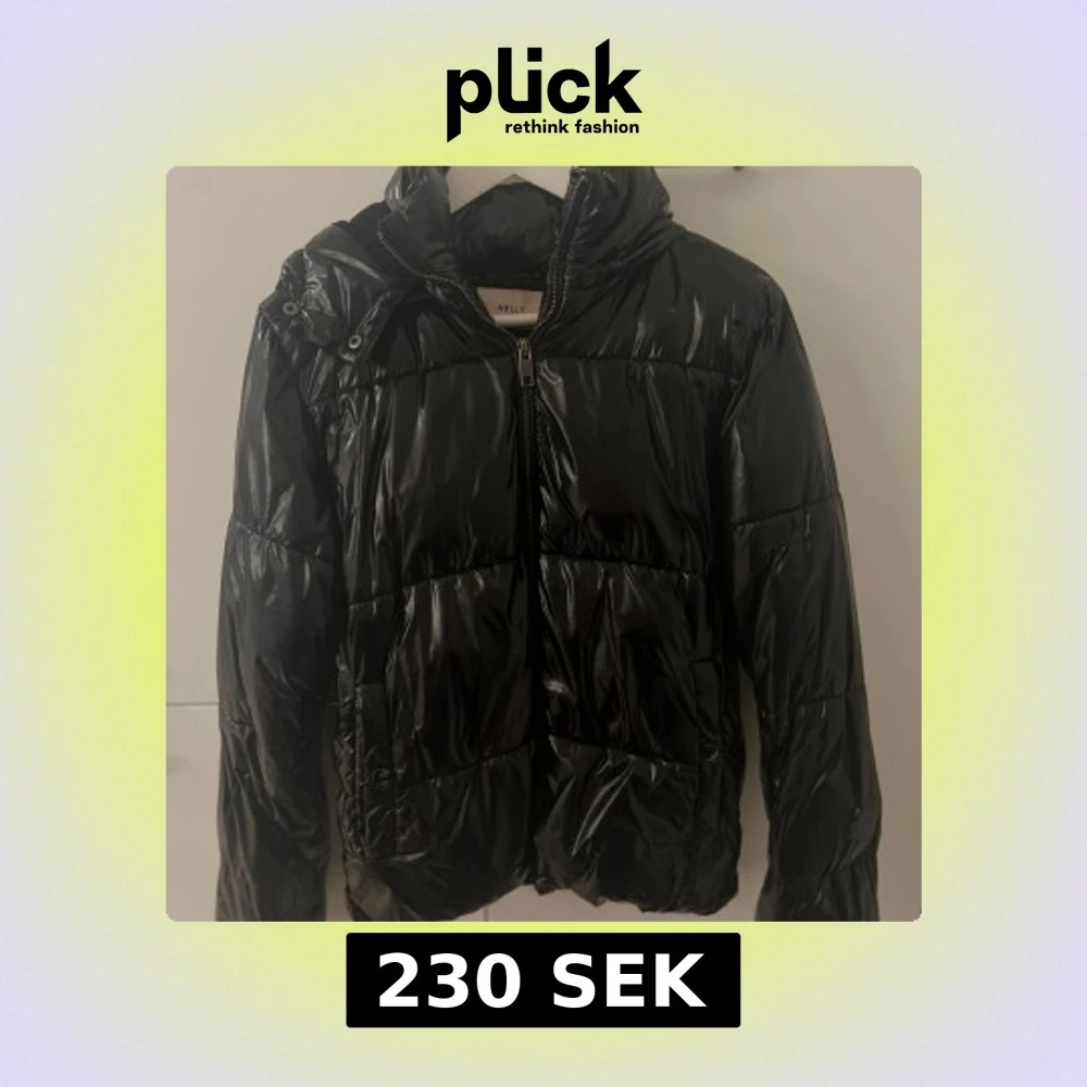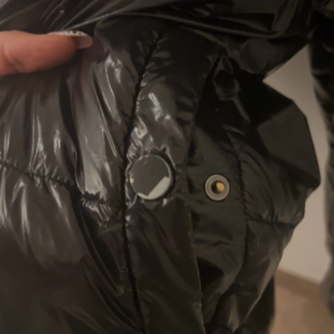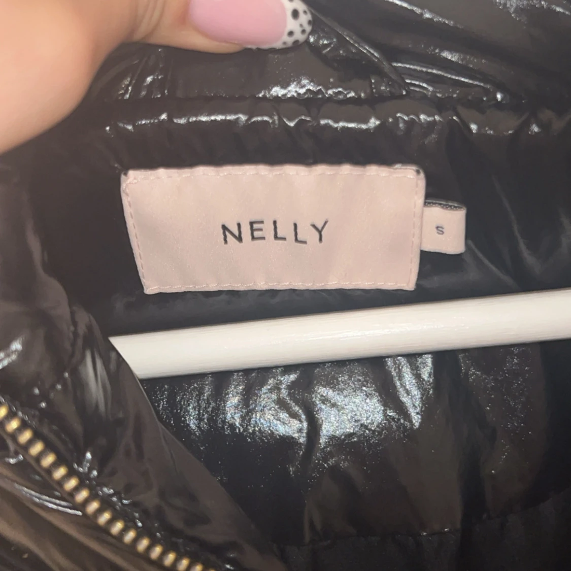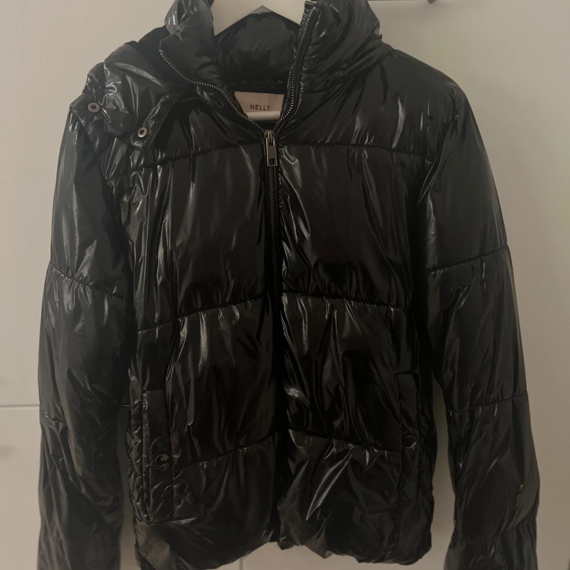 Snygg svart pufferjacka från Nelly i glansigt material. Jackan har huva, dragkedja framtill och tryckknappar vid fickorna. de har lossnat färg från knapparna på fickorna. Det är lite ludd vid armvecket på armarna men det är inget som syns när man har på den. Det är även några defekter vid armarna och dragkedjan. Skriv till mig om du vill ha fler bilder kunde inte stoppa in alla