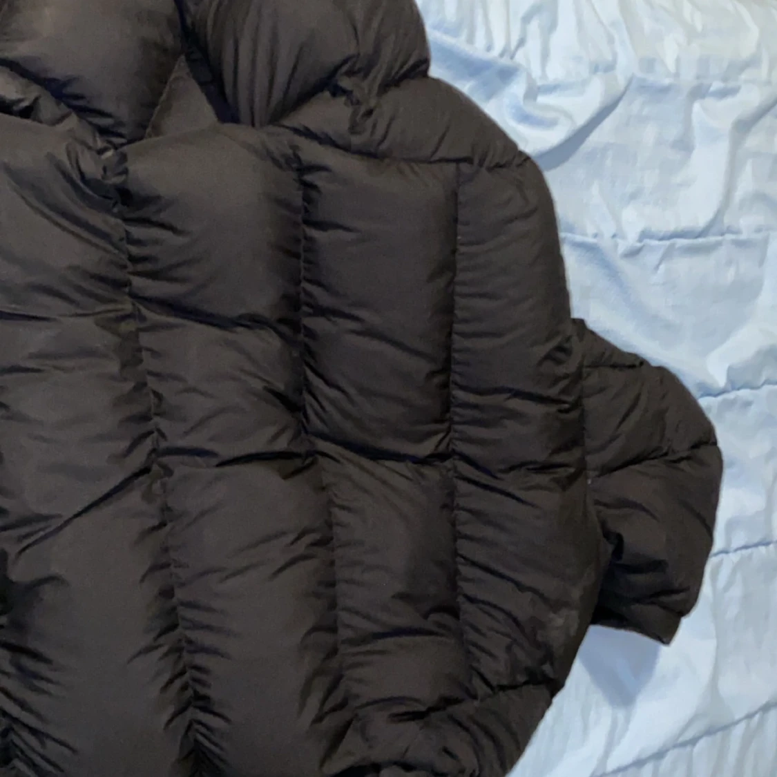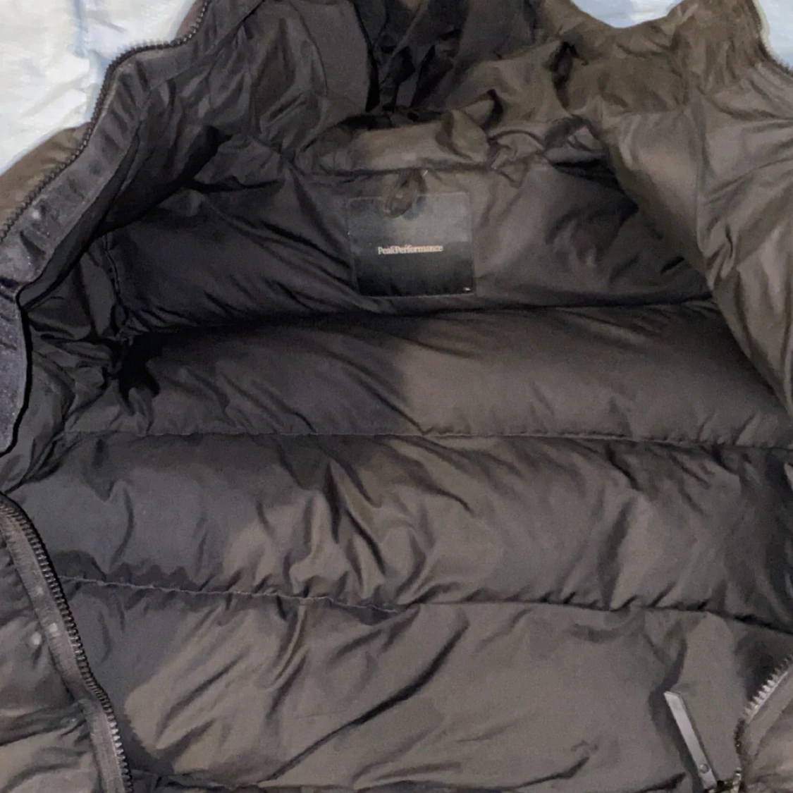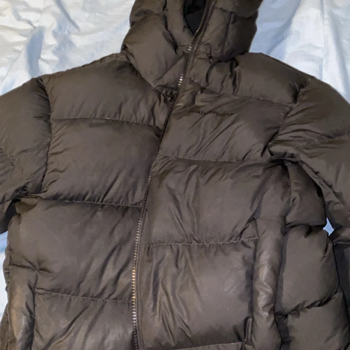 Säljer en svart pufferjacka från Peak Performance med hög krage och huva. Jackan har breda, quiltade sektioner och dragkedja framtill. Perfekt för kalla dagar och har en clean, modern look som funkar till de flesta stilar.