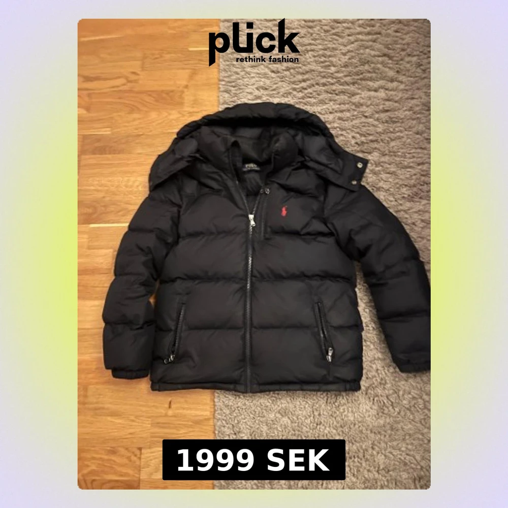 Svart pufferjacka från Polo Ralph Lauren med huva och två dragkedjeförsedda fickor. Jackan har en röd Polo-logga på bröstet och grov dragkedja framtill. Perfekt för kalla dagar och har en schysst, puffig look. Priset är inte fast.
