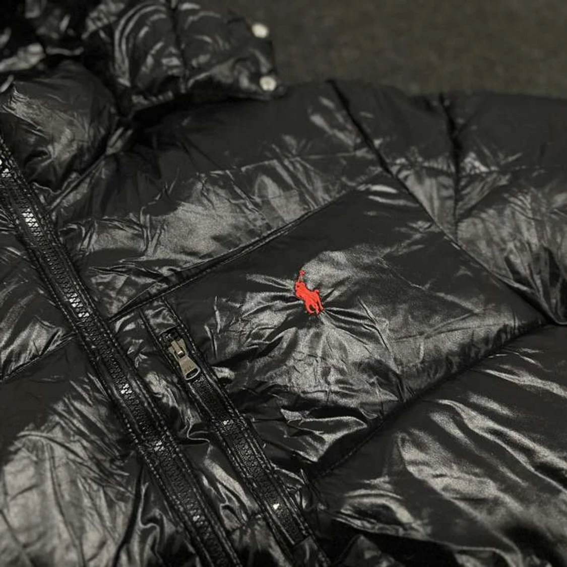 Snygg svart pufferjacka från Polo Ralph Lauren med glansig finish och röd broderad logga på bröstet. Jackan har huva, dragkedja framtill och två stora fickor med dragkedja. Perfekt för kalla dagar och riktigt street.