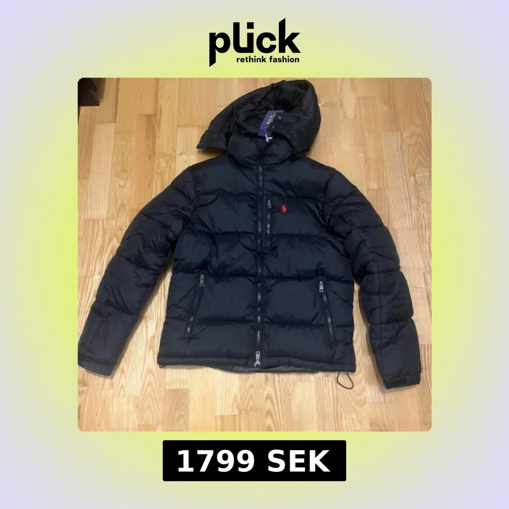 Svart pufferjacka med röd broderad logga på bröstet. Jackan har huva, flera dragkedjefickor och quiltad design. Materialet är syntet och dun, perfekt för kalla dagar. Stängs med dragkedja framtill och har en clean, modern look.