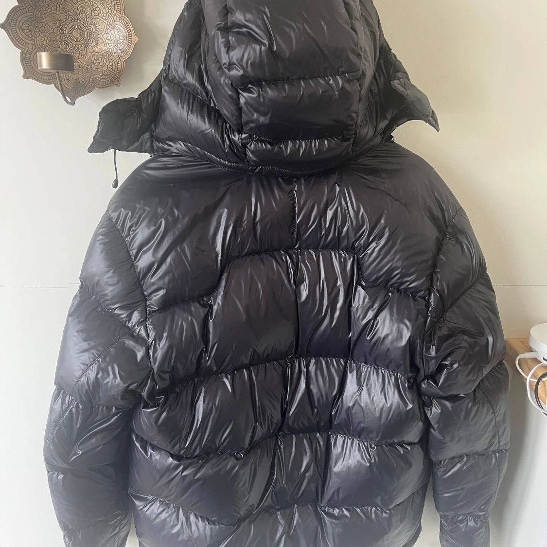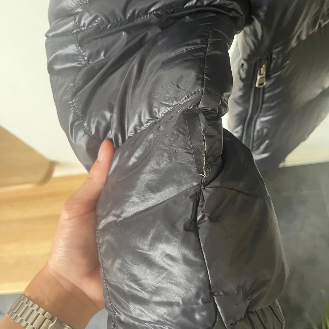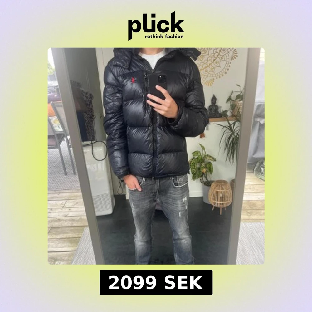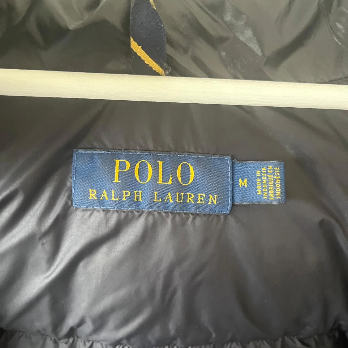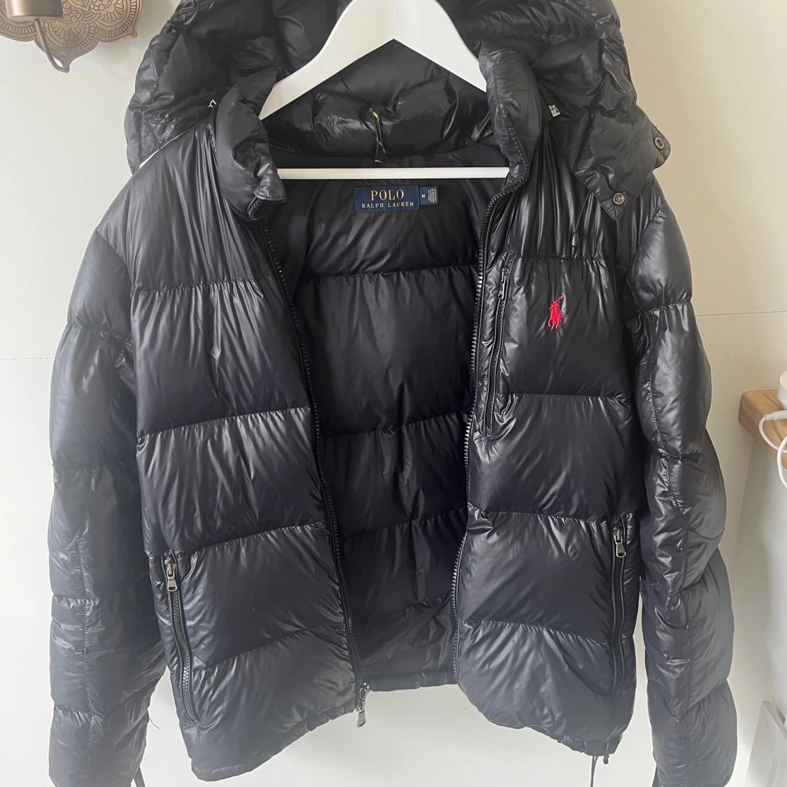 Säljer en svart pufferjacka från Polo Ralph Lauren med huva och dragkedja. Jackan har en glansig finish, broderad röd logga på bröstet och flera fickor med dragkedja. Perfekt för kalla dagar och riktigt snygg stil. Den har en lätt skada på ärmen som man ser på sista bilden.