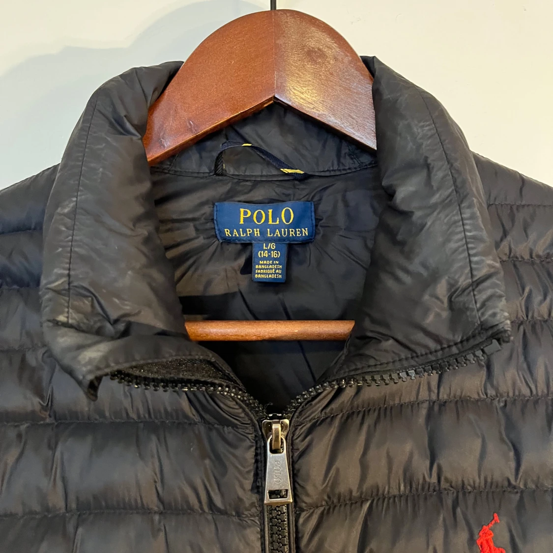 Svart pufferjacka från Polo Ralph Lauren med klassisk quiltad design och röd broderad logga på bröstet. Jackan har hög krage, dragkedja framtill och två fickor med dragkedja. Perfekt för kyliga dagar och riktigt snygg till streetwear.