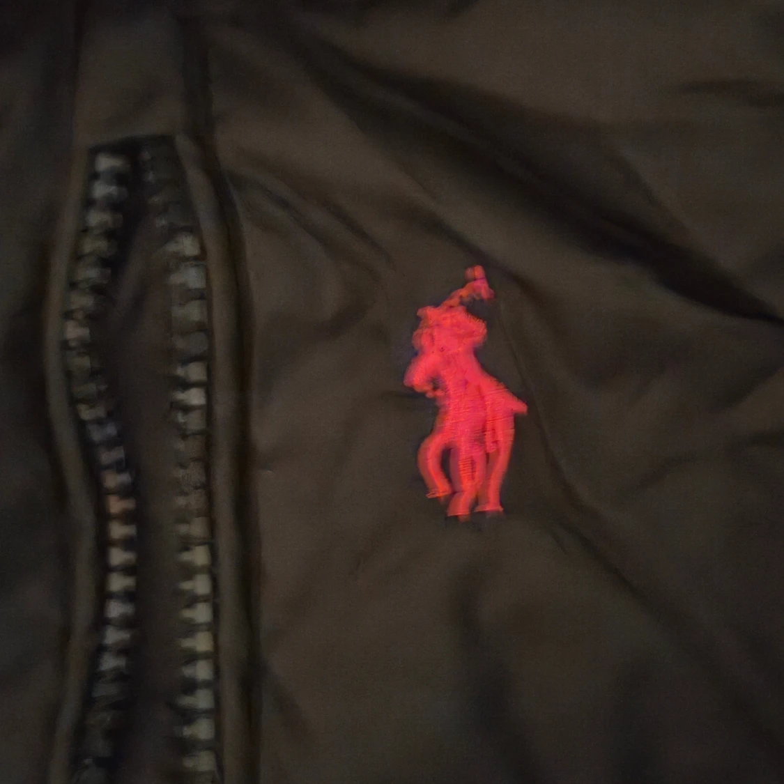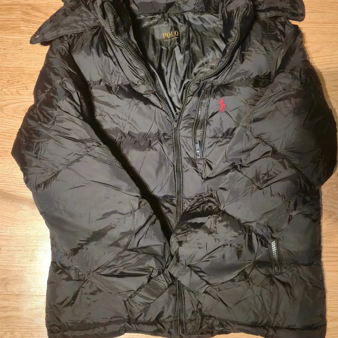 Svart pufferjacka från Polo Ralph Lauren med röd broderad logga på bröstet. Jackan har huva med snörning, dragkedja framtill och flera fickor med dragkedja. Perfekt för kalla dagar och riktigt snygg streetstil.