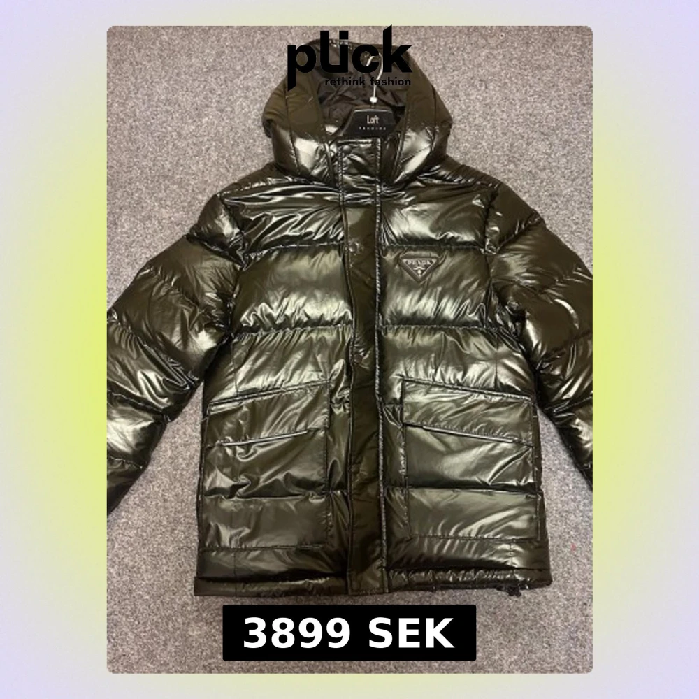 Säljer en svart, glansig pufferjacka från Prada med huva och stora fickor framtill. Jackan har klassisk quiltad design, dragkedja och ikonisk Prada-logga på bröstet. Perfekt för kalla dagar och riktigt snygg streetstil.
