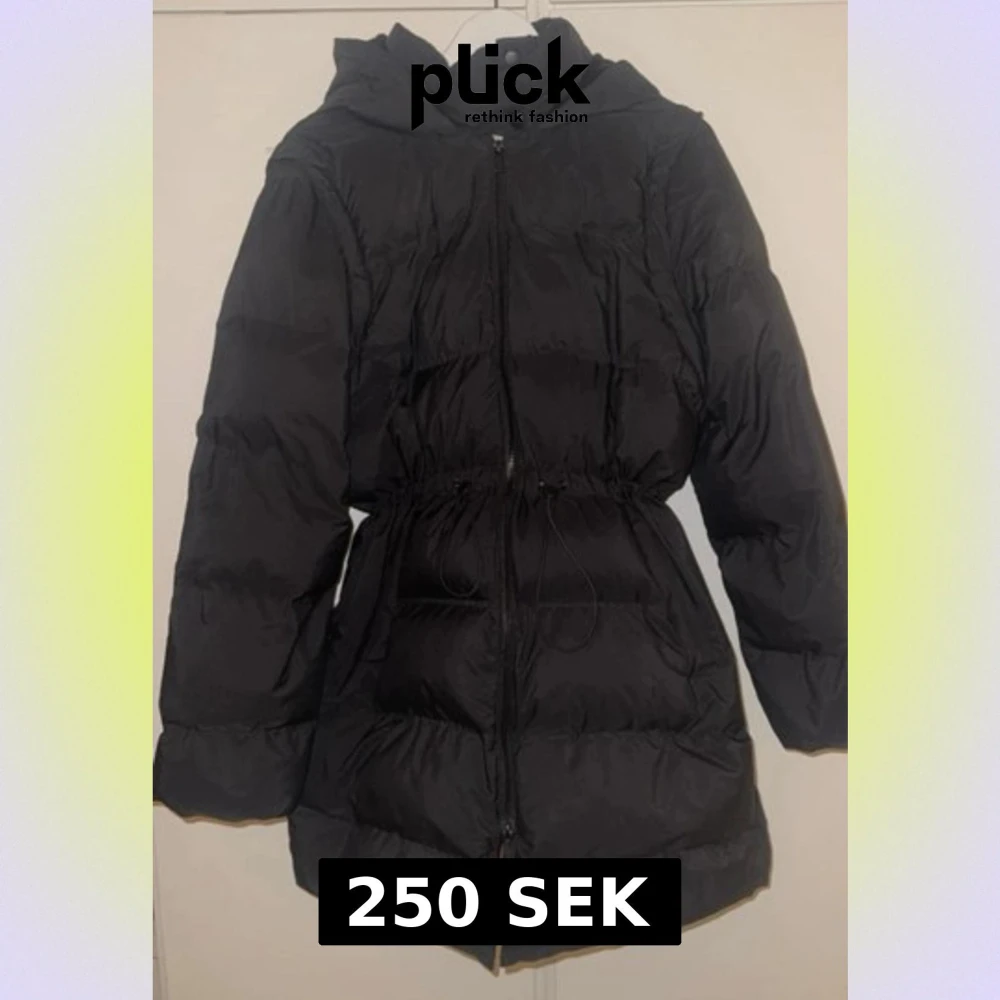 Svart pufferjacka från Primark Maternity i storlek M. Jackan har huva, dragkedja och snörning i midjan för en snygg siluett. Insidan är beige och materialet är syntet. Perfekt för kalla dagar med sin långa modell och quiltade design. Går även att ta av armarna och göra de till en väst.