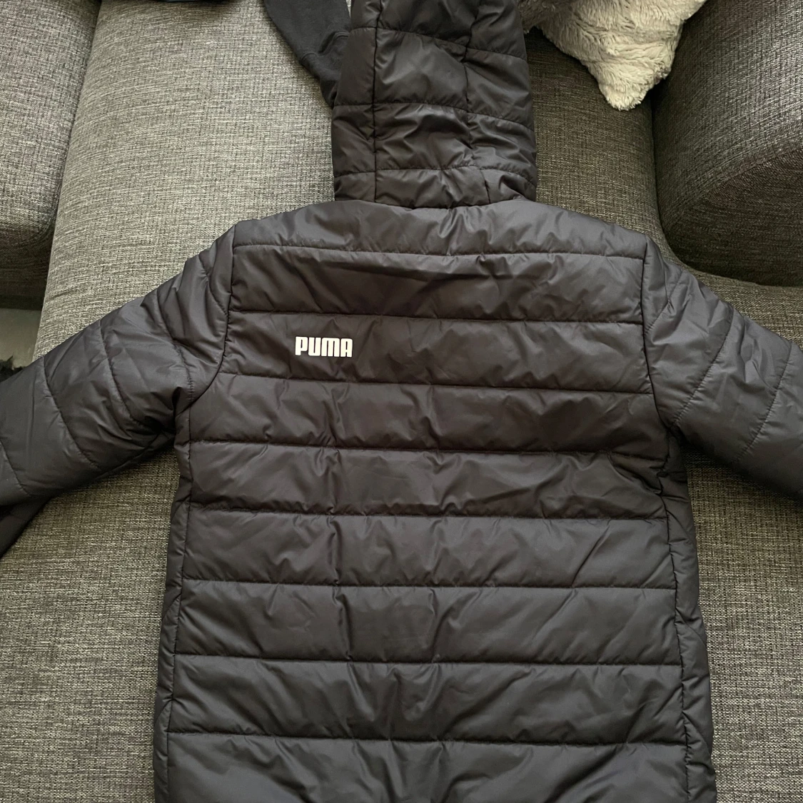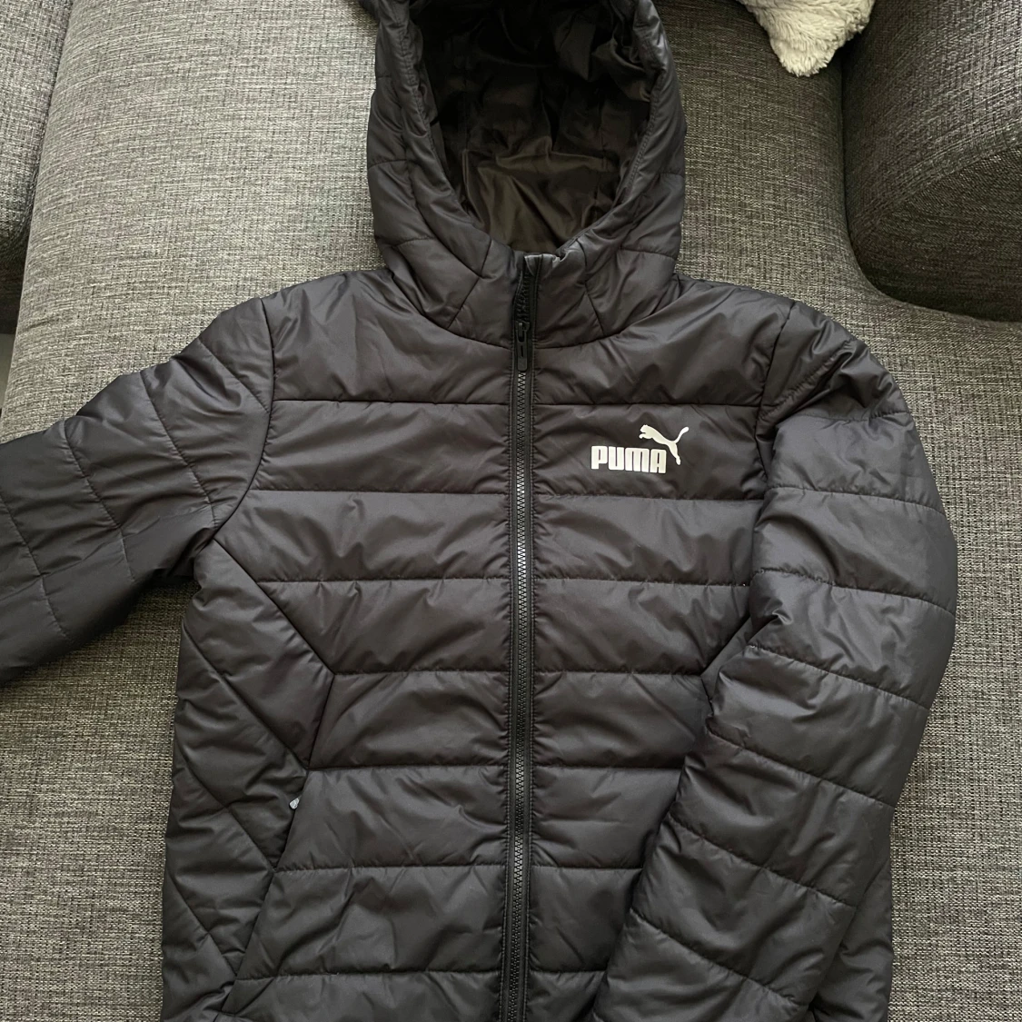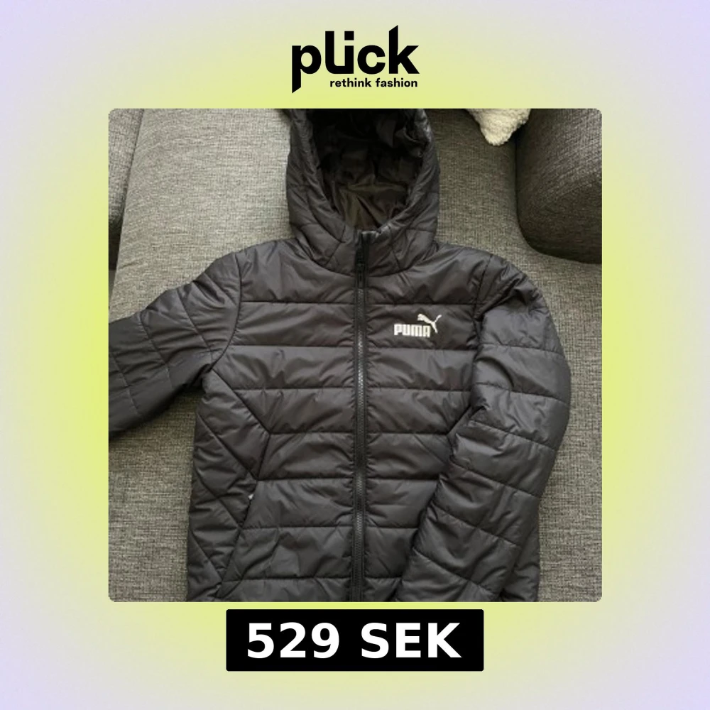 Säljer en svart pufferjacka från Puma med huva och dragkedja. Jackan har ett stilrent quiltat mönster och Puma-logga både fram och bak. Perfekt för kyligare dagar och enkel att matcha med det mesta. Endast testad annars är den helt ny och passar både män och kvinnor🤩. Ordpris:629