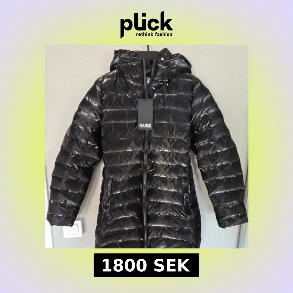Säljer en svart, glansig lång pufferjacka från Rains med huva och dragkedja framtill. Jackan har en quiltad design och två fickor på sidorna. NYPRIS 3400 SEK!