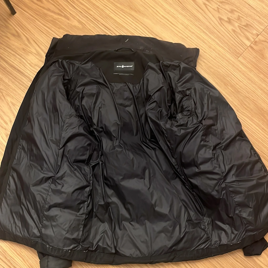 Säljer en svart pufferjacka från Sail Racing med huva och broderad logga på både bröstet och huvan. Jackan har dragkedja framtill och flera praktiska fickor. Perfekt för kalla dagar när du vill hålla stilen och samtidigt vara varm. Lite hål runt baksidan av armen men det går att sy ihop matchar avän priset