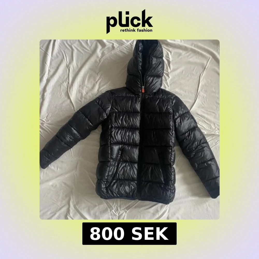 Säljer en svart pufferjacka från Save The Duck med huva och dragkedja. Jackan är quiltad och har orange foder med texten '100% Animal Free'. Märke på ärmen. Perfekt för kalla dagar och riktigt snygg streetstil. Storlek xs 164