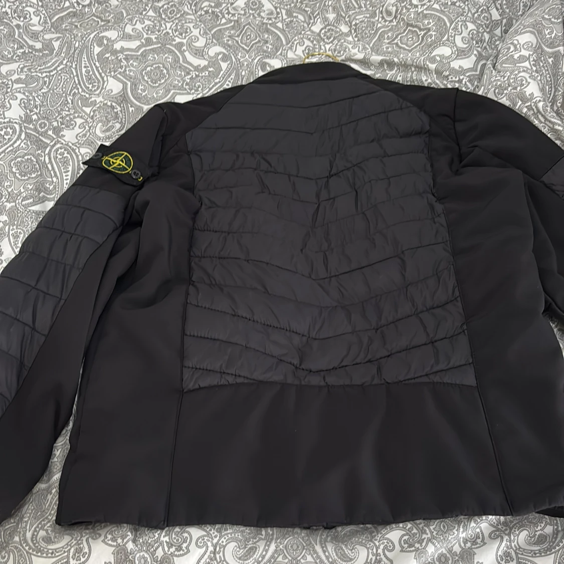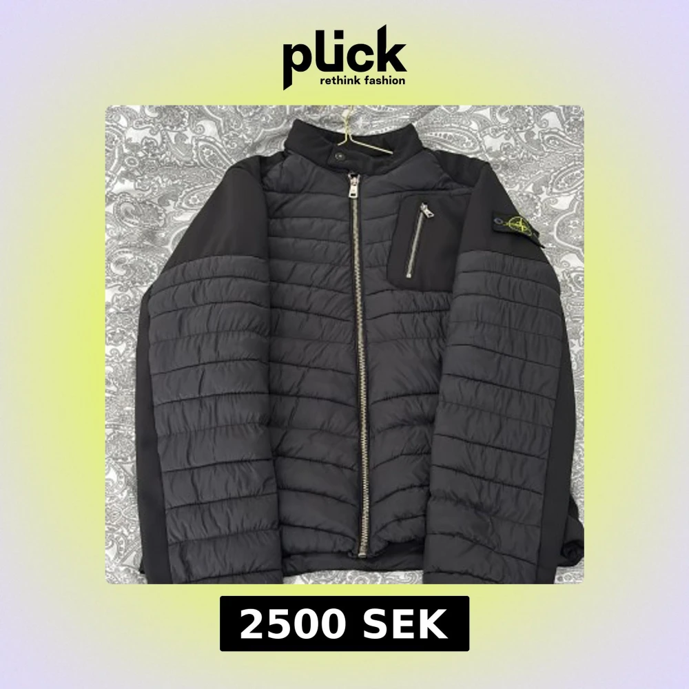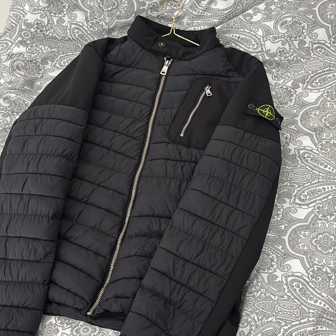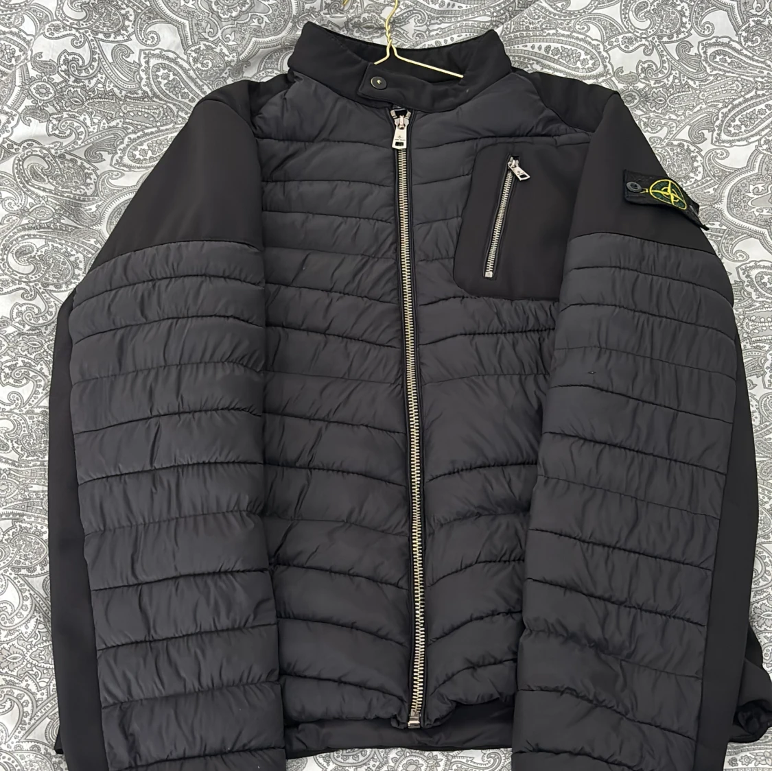 Säljer en svart pufferjacka från Stone Island med klassisk patch på ärmen. Jackan har quiltad design, bröstficka med dragkedja och hög krage med knapp. Perfekt för dig som vill ha en stilren och sportig look.