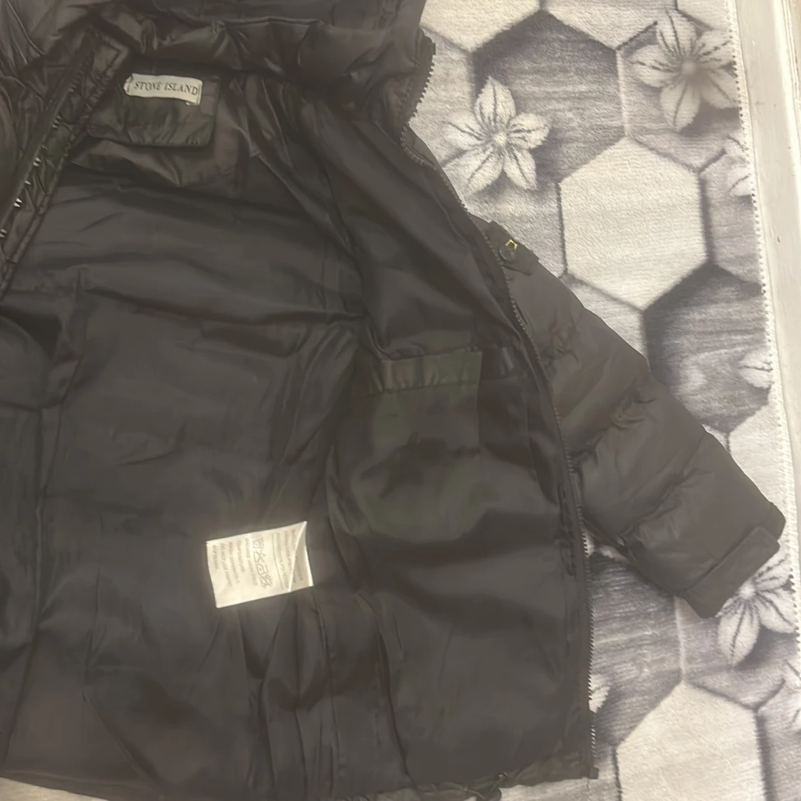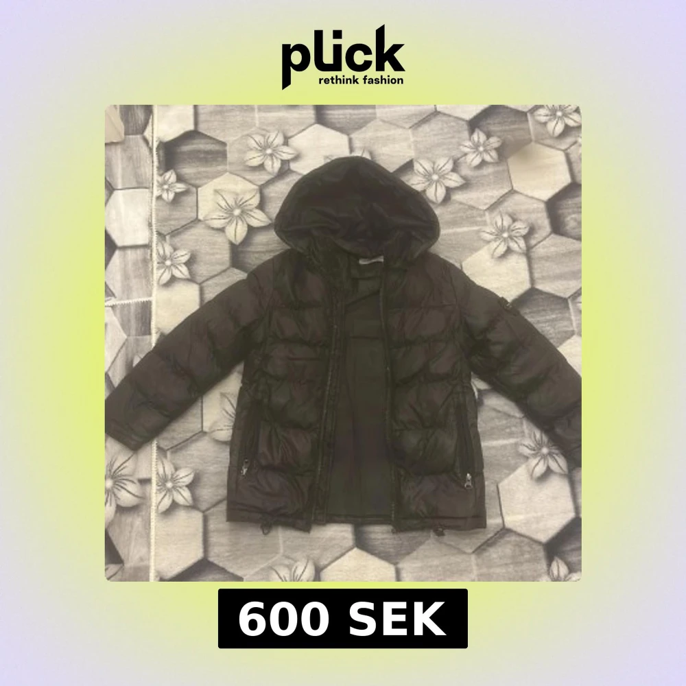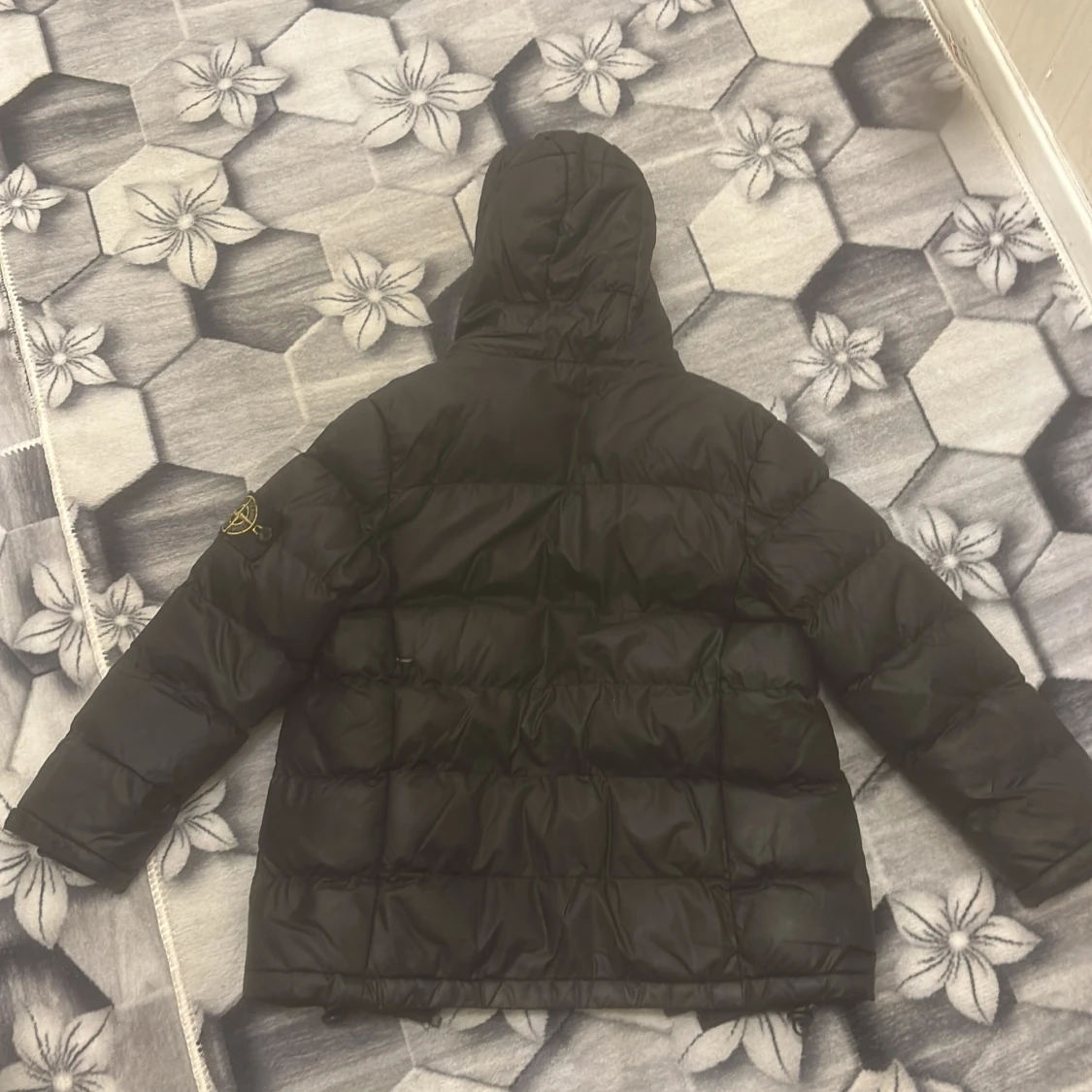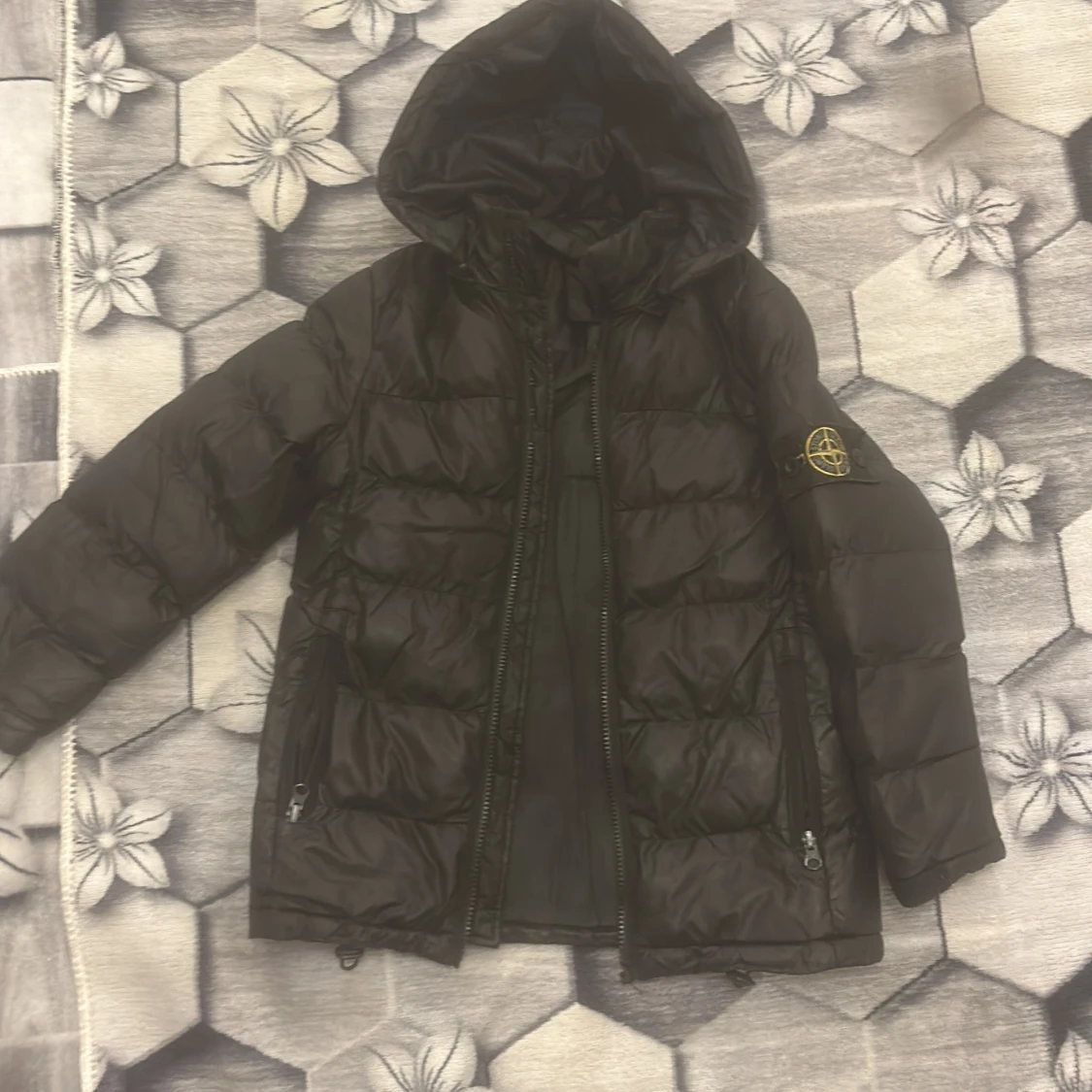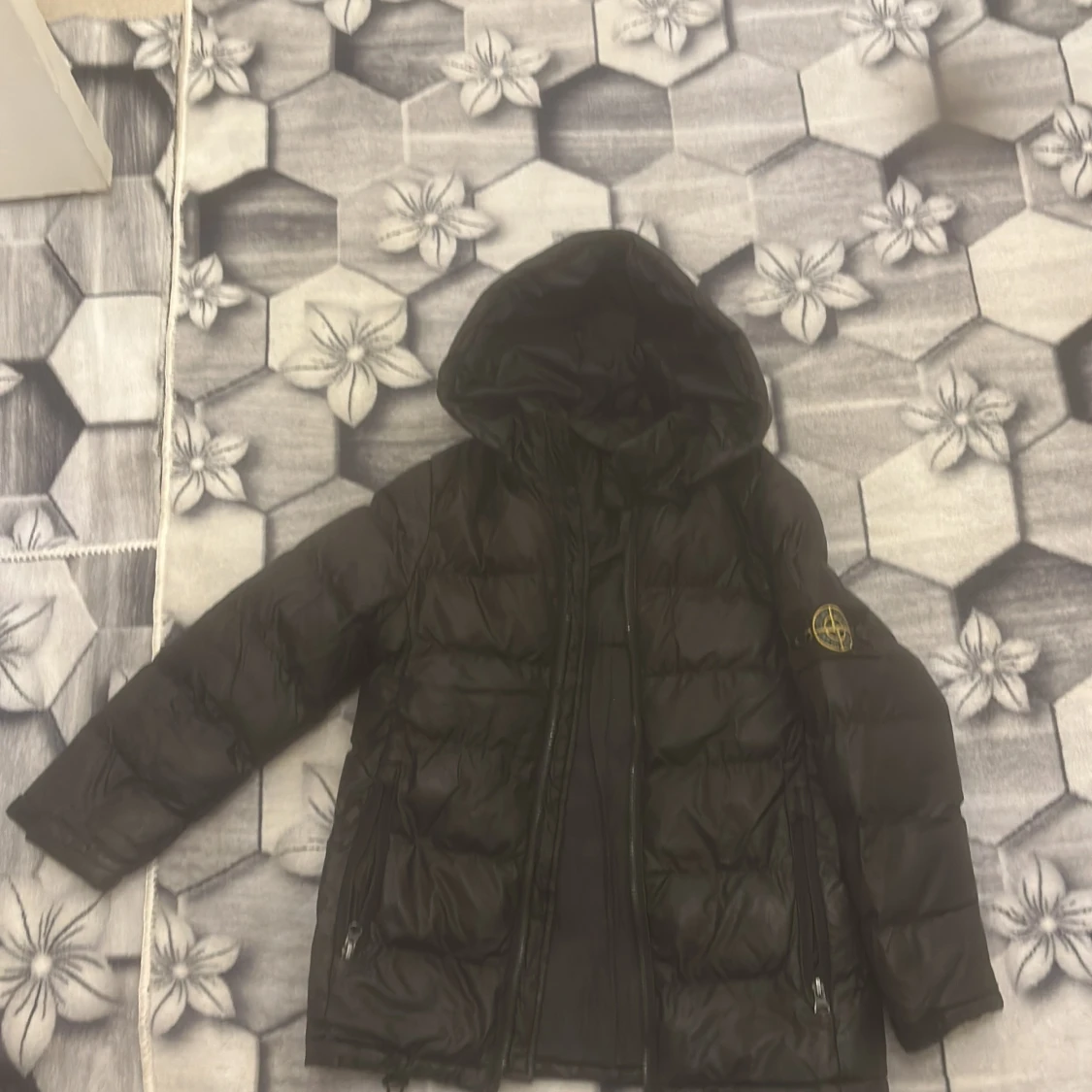 Säljer en svart pufferjacka från Stone Island med huva och klassisk patch på vänster ärm. Jackan har dragkedja framtill, två fickor med dragkedja och quiltad design. Perfekt för kalla dagar och riktigt snygg streetstil.