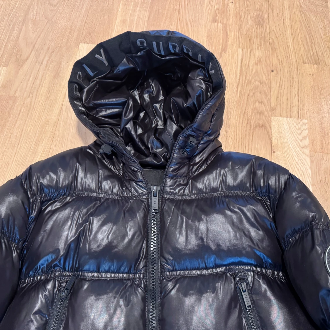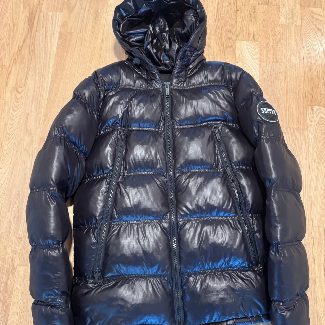 Snygg svart pufferjacka från Supply & demand med glansig finish och huva. Jackan har dragkedja framtill och två sidofickor med dragkedjor. Perfekt för kyliga dagar. Nypris: 3000 kr.