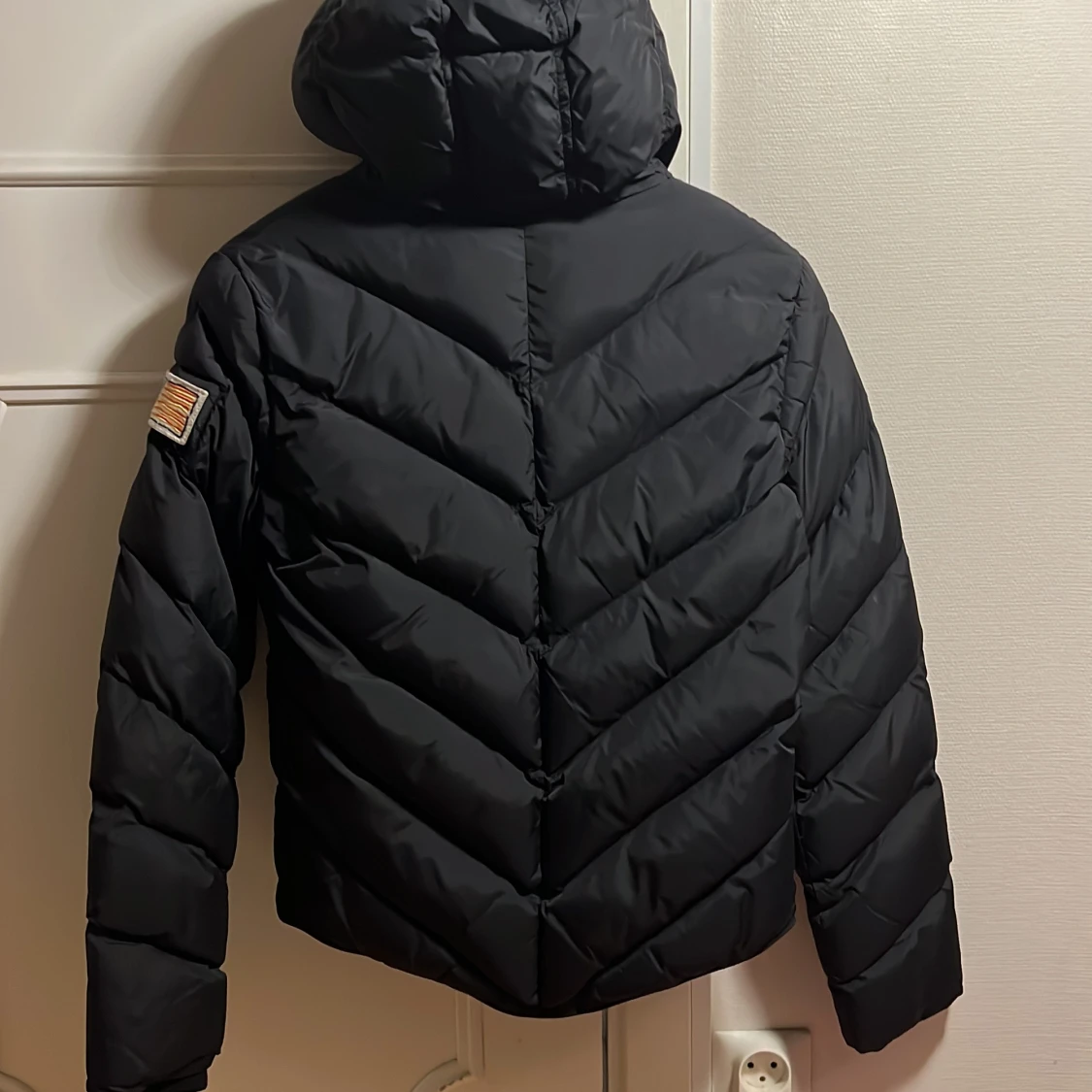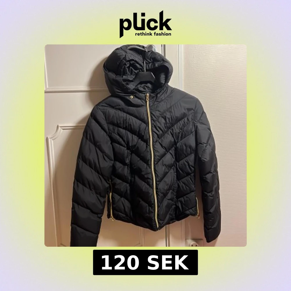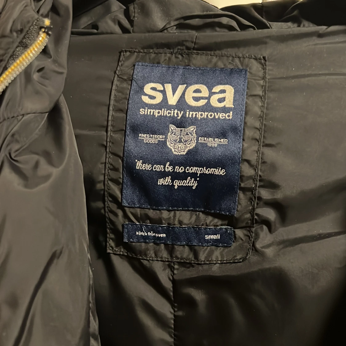 Snygg svart pufferjacka från Svea med huva och dragkedja i guld. Jackan har ett quiltat mönster och är perfekt för kyligare dagar. Den har långa ärmar och en liten patch på ärmen.