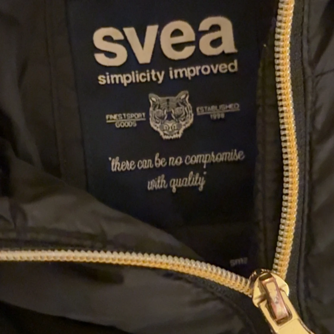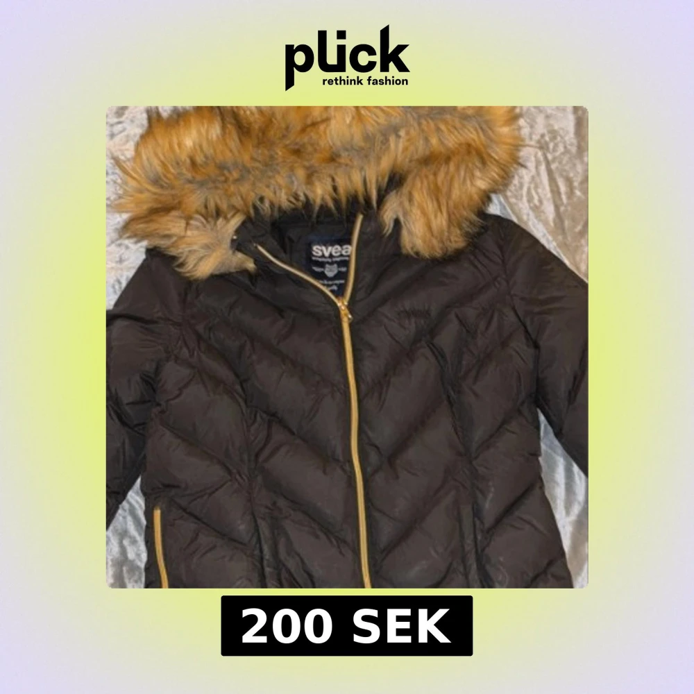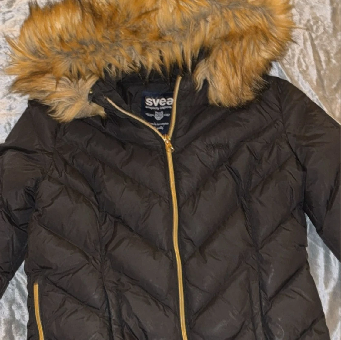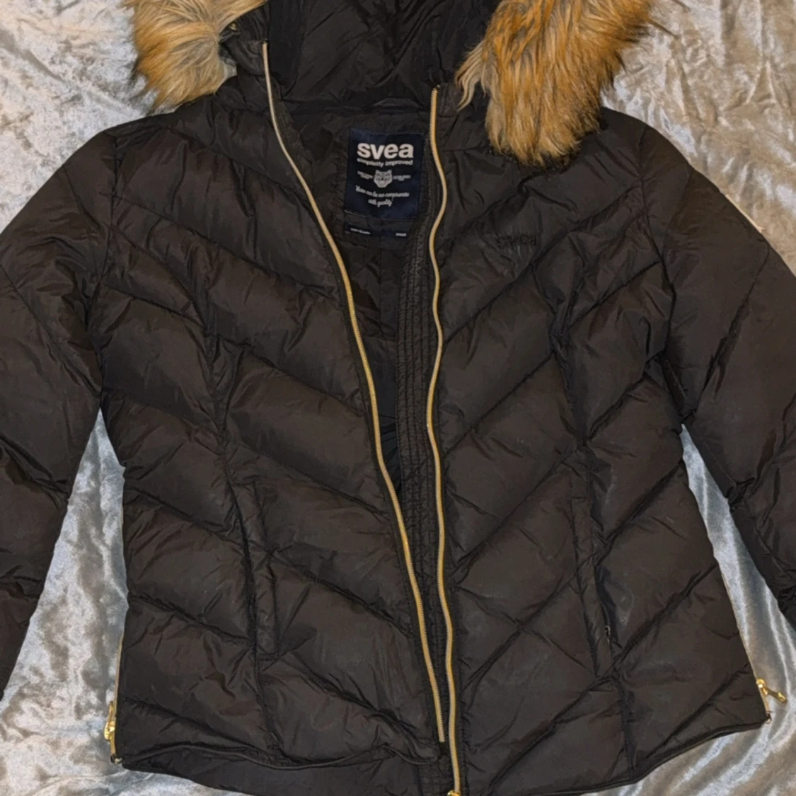 Säljer en svart pufferjacka från Svea med snygg guldfärgad dragkedja och huva med fluffig fuskpäls. Jackan har quiltad design, två sidofickor med dragkedja och lång ärm. Perfekt för kalla dagar och har en cool streetstil.