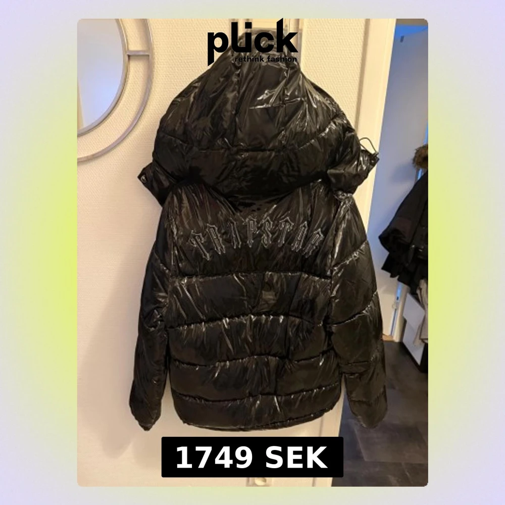 Säljer en svart, glansig pufferjacka från Trapstar med huva och broderad logga på ryggen. Jackan har dragkedja framtill, två fickor och coolt emblem på bröstet. Materialet är 100% polyester och jackan har en oversized vibe som är riktigt street.