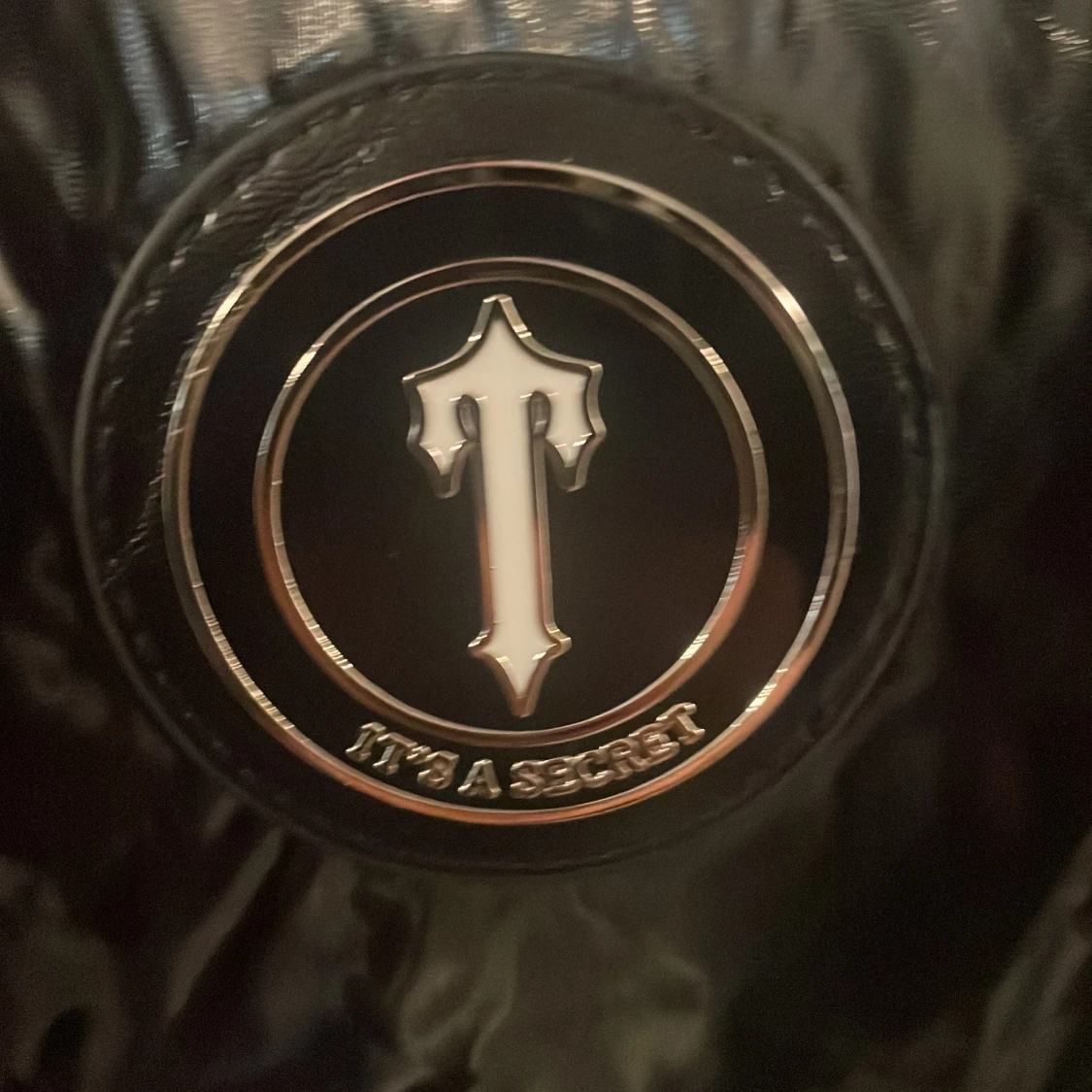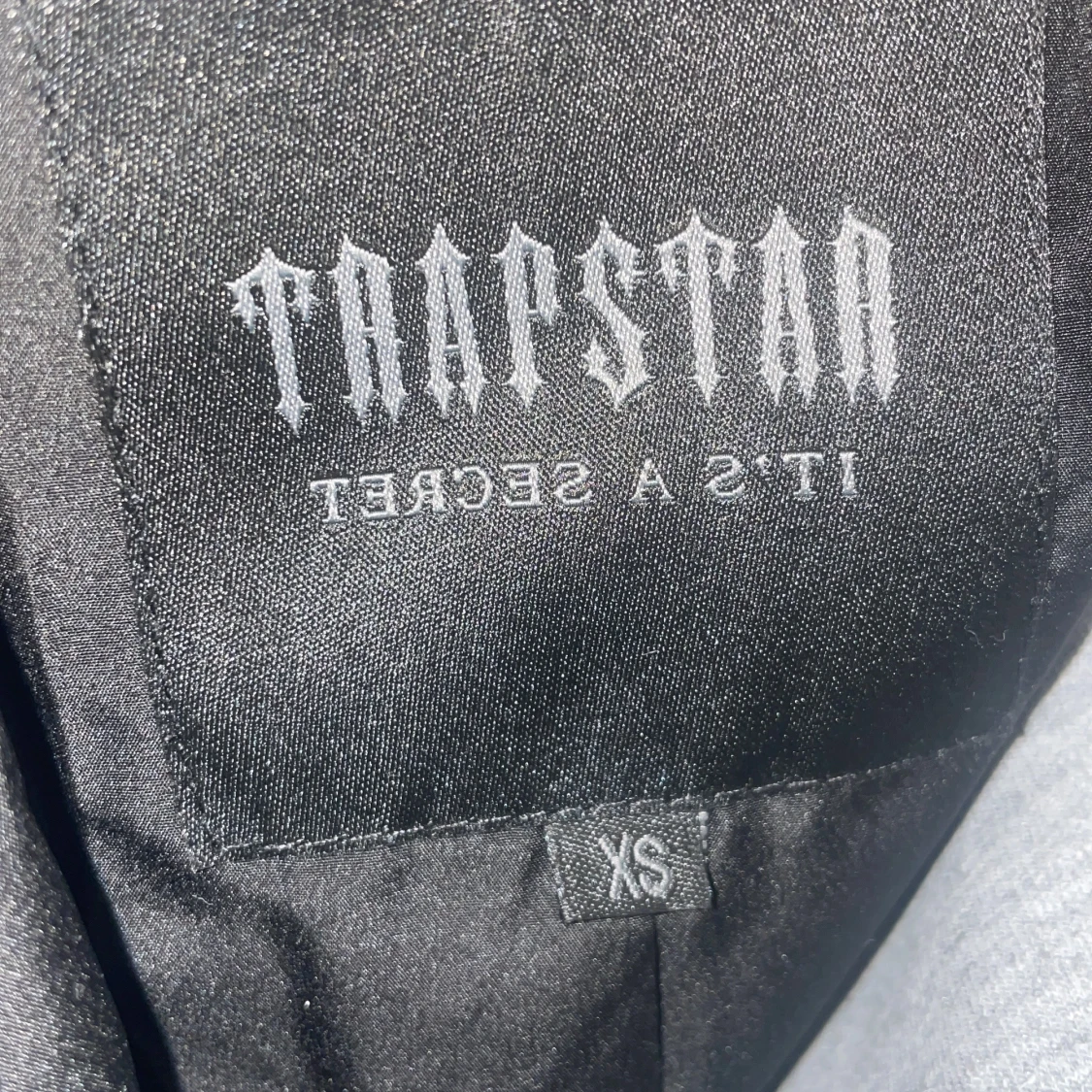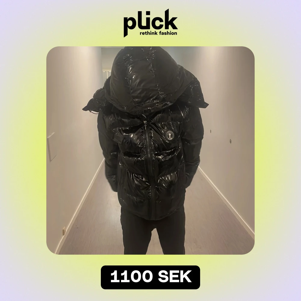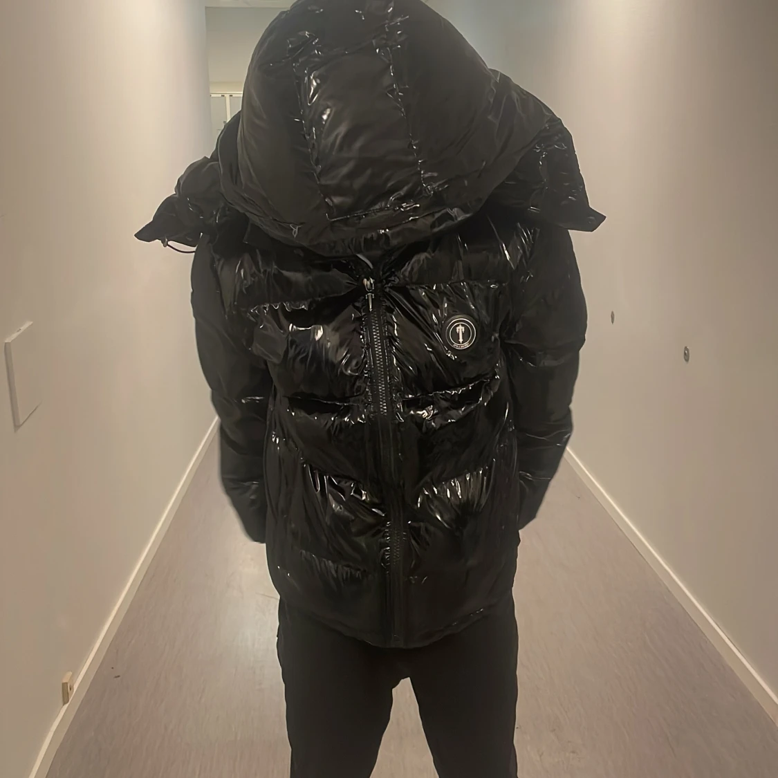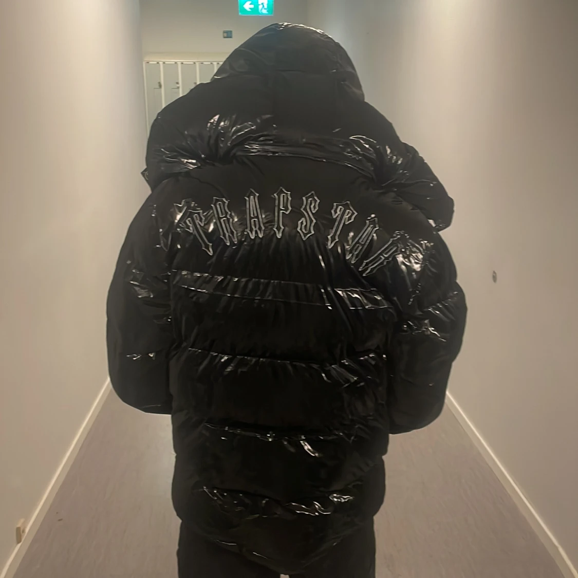 Säljer en svart, glansig pufferjacka från Trapstar i storlek XS. Jackan har en stor huva och dragkedja framtill. Den är perfekt för kalla dagar och har en cool logga på bröstet samt texten 'Trapstar' på ryggen. Passar perfekt för vintern och hösten!