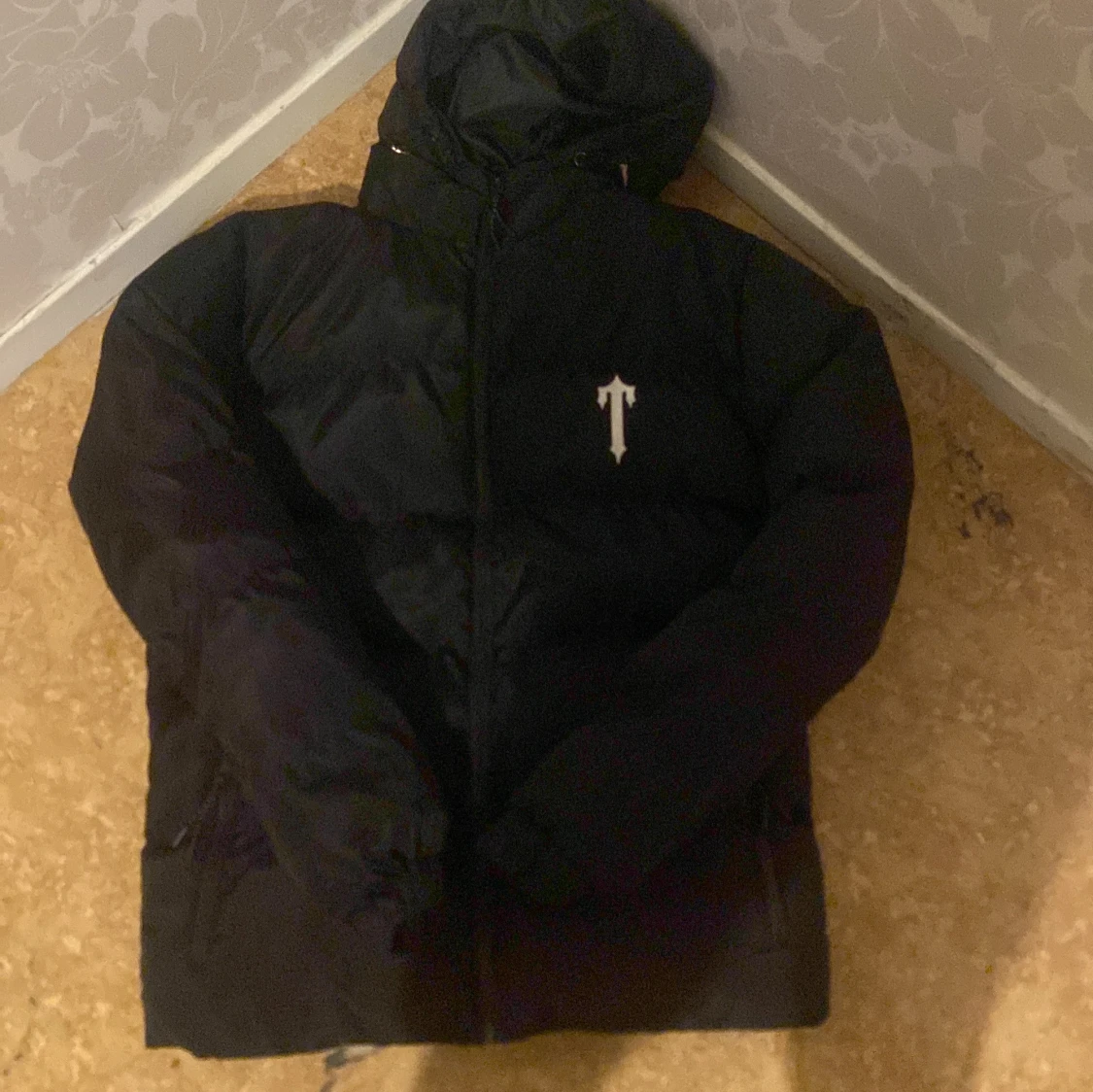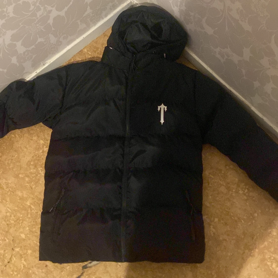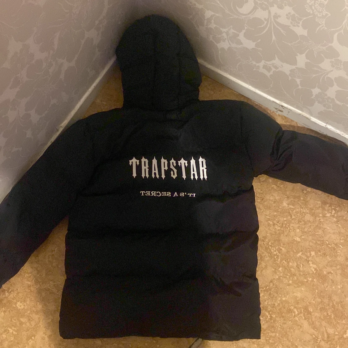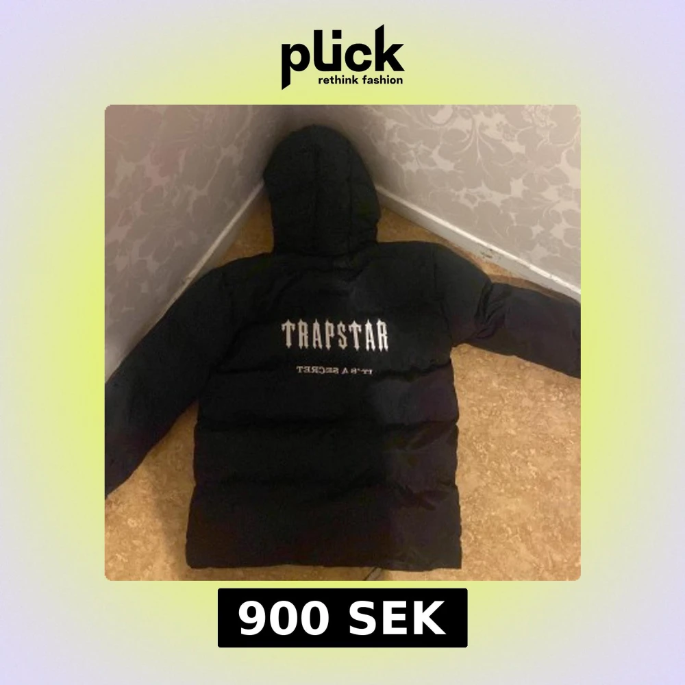Säljer en svart pufferjacka från Trapstar med huva och dragkedja. Jackan har logga på bröstet och stor Trapstar-tryck på ryggen. Perfekt för kalla dagar när du vill hålla stilen.