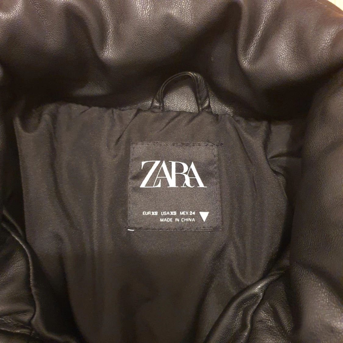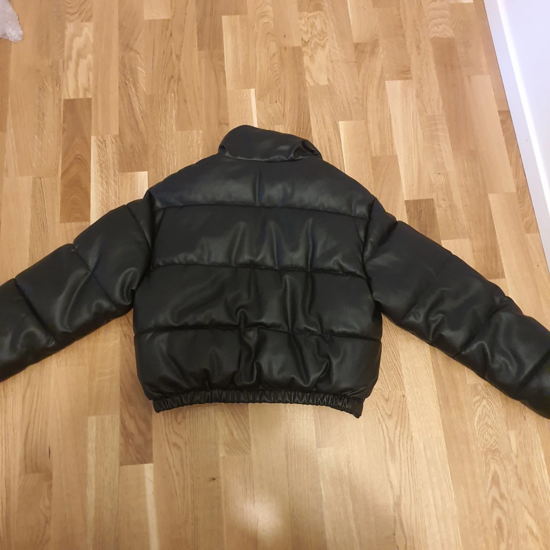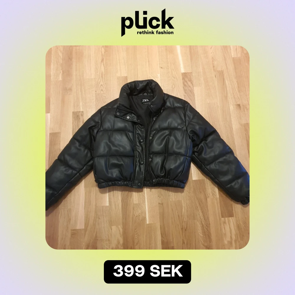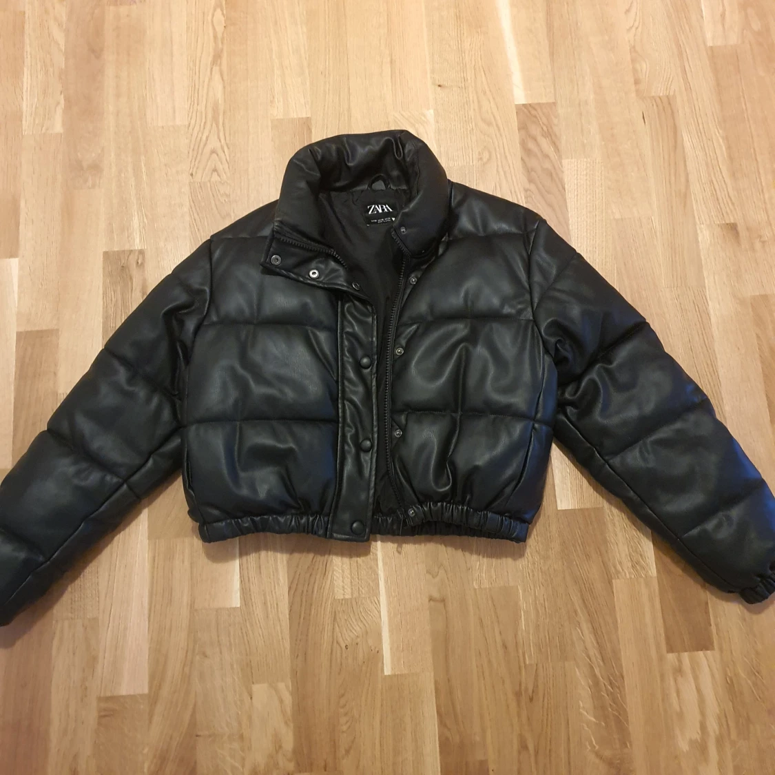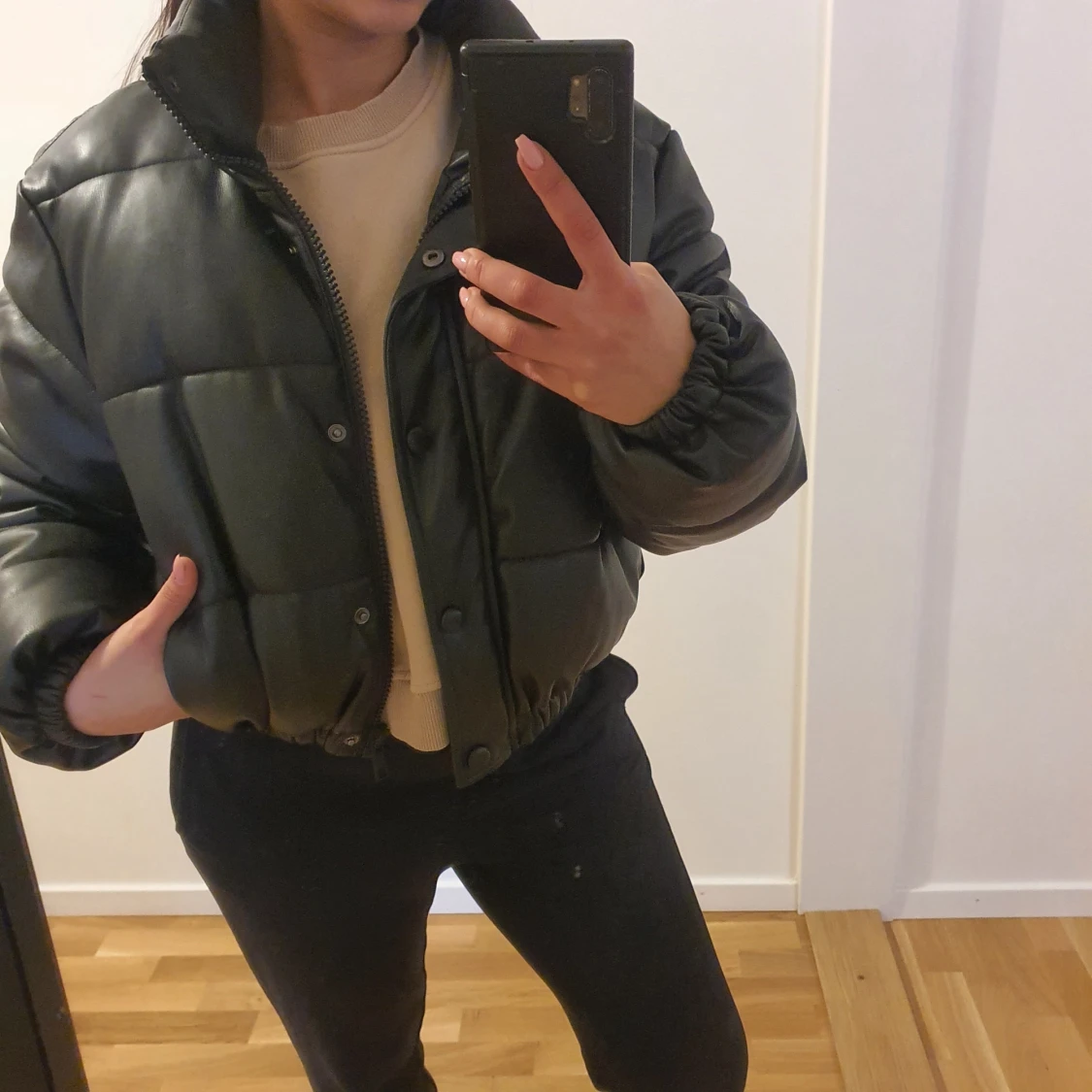 Snygg svart skinn pufferjacka från Zara i stl xs, men går att använda som stl.S också.. Jackan har en quiltad design med dragkedja och knappar framtill. Perfekt för kyligare dagar med sin vadderade stil och långa ärmar. Ny pris 1200kr