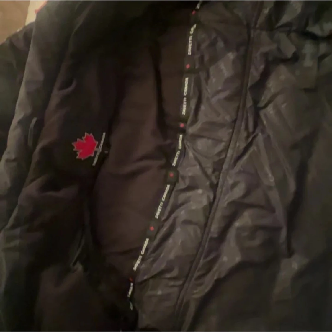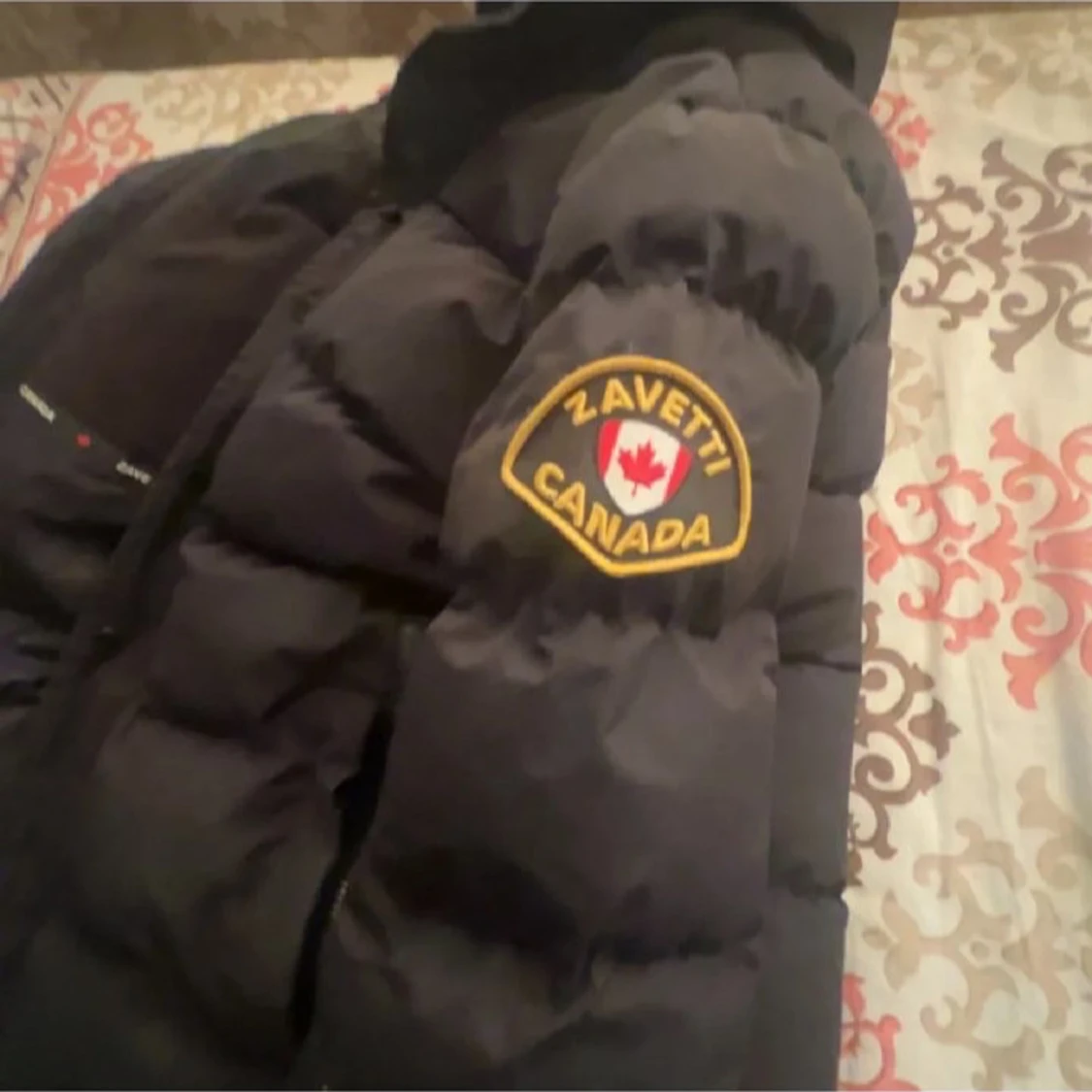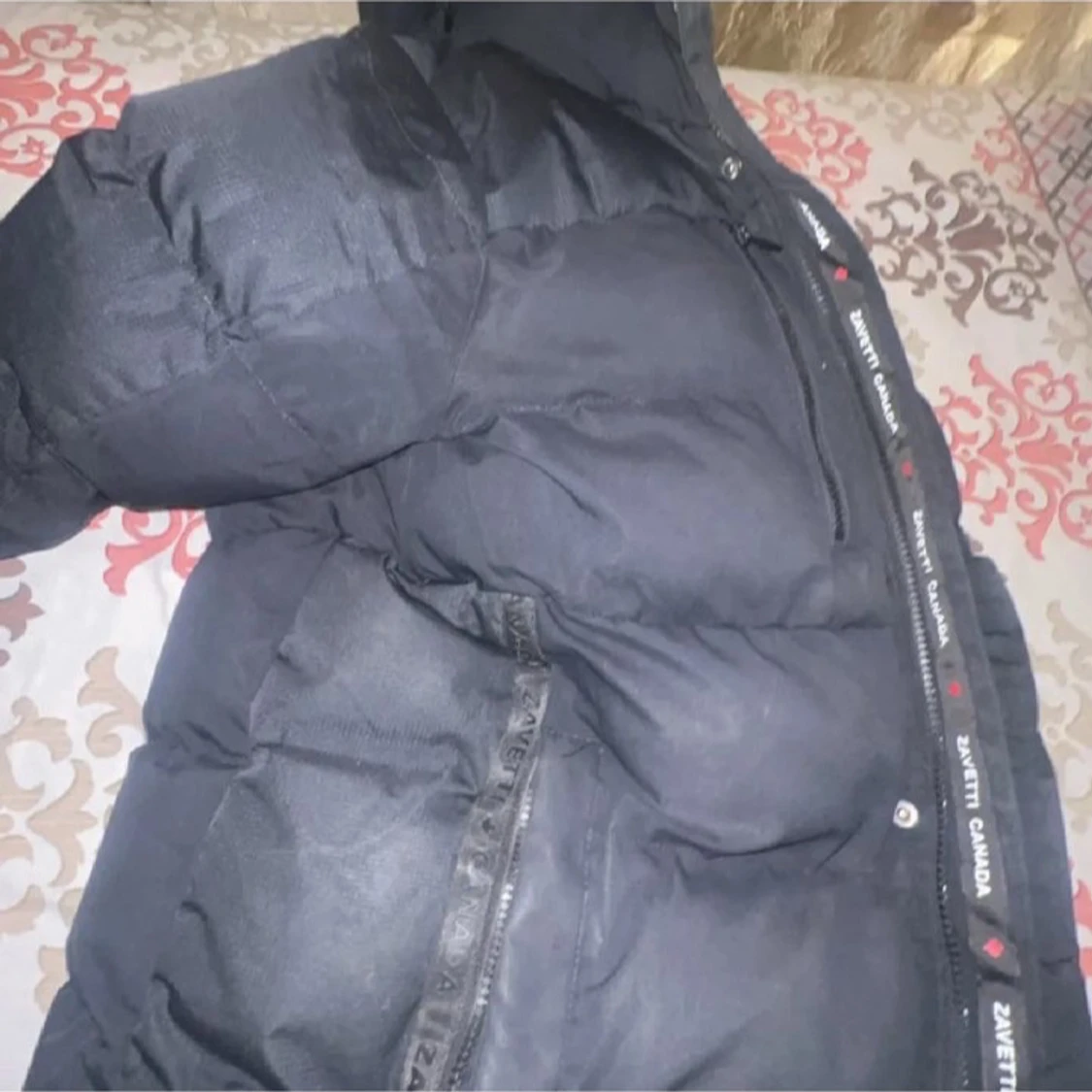 Säljer en svart pufferjacka från Zavetti Canada med huva och tydlig logga på ärmen. Jackan har quiltad design, dragkedja framtill och är perfekt för kalla dagar. Fodret är tjockt och jackan har en modern, lite oversized look.