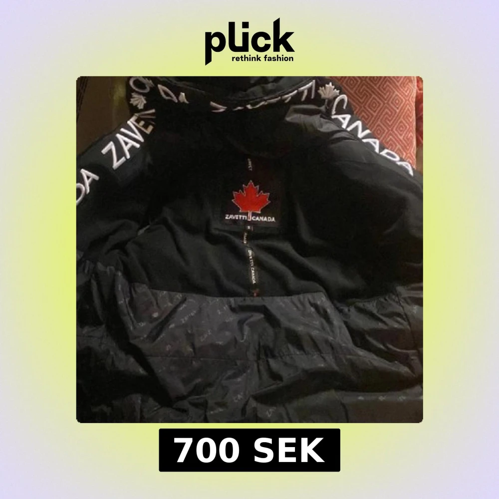 Säljer en svart pufferjacka från Zavetti Canada med stor huva och feta loggor på både insidan och utsidan. Jackan har flera fickor framtill, dragkedja och broderad patch med röd lönnlöv på bröstet. Perfekt för kalla dagar och riktigt snygg streetstil.
