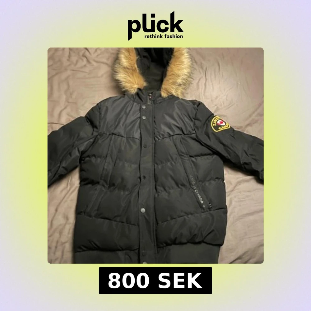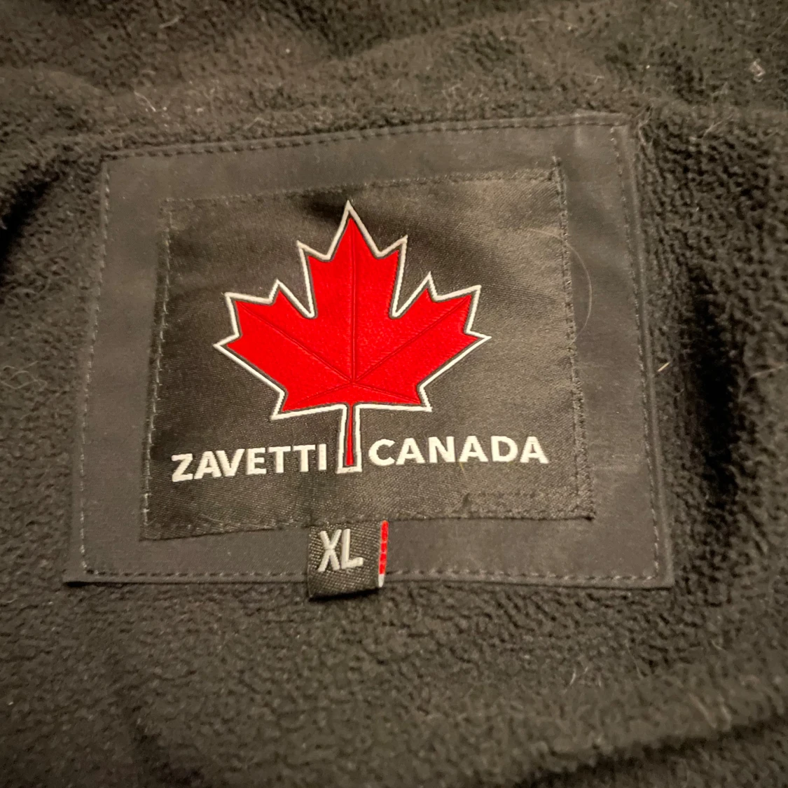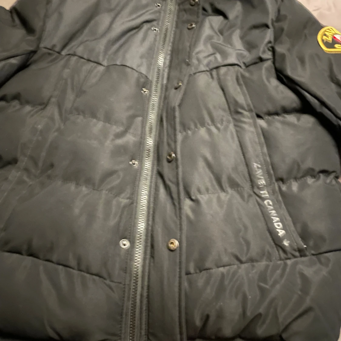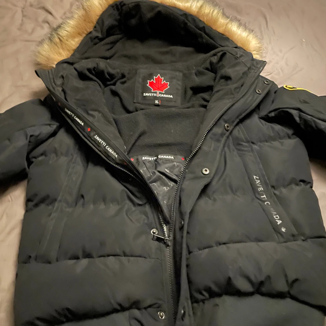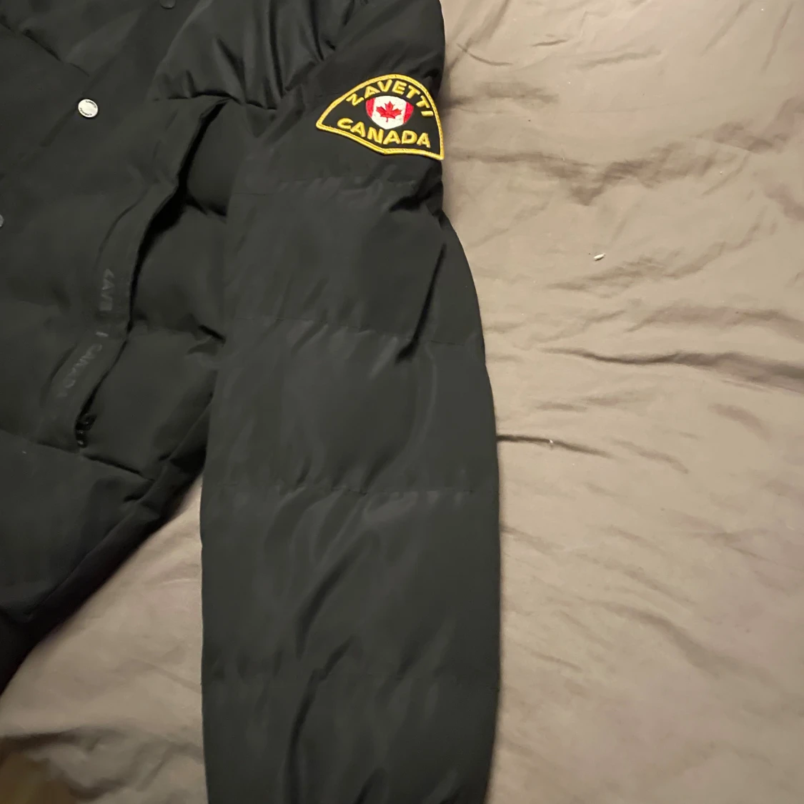 Säljer en svart pufferjacka från Zavetti Canada med stor huva och fuskpäls. Jackan har dragkedja och knappar framtill, samt en patch på ärmen. Perfekt för kalla dagar och riktigt snygg streetstil.