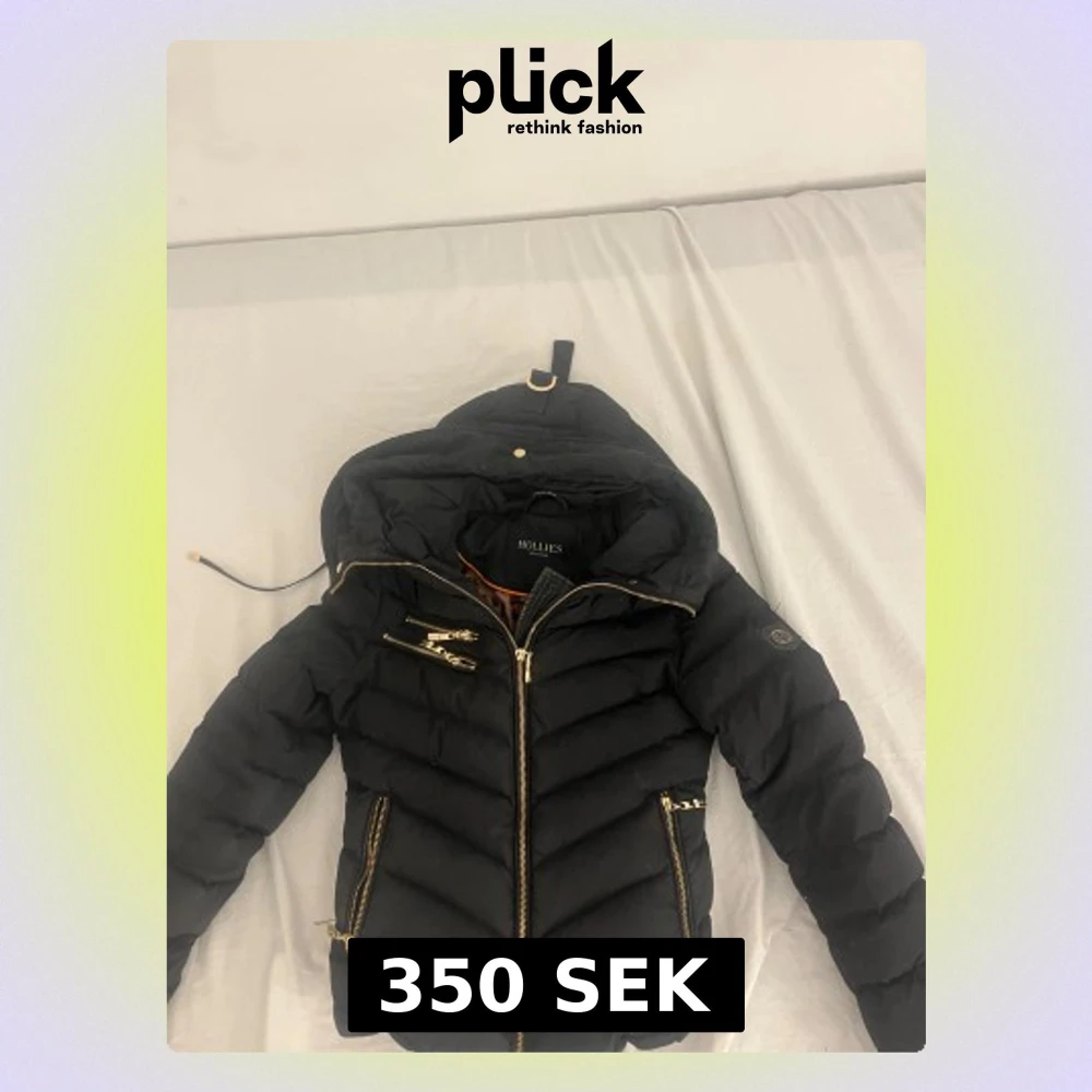 Snygg svart pufferjacka från Hollies med guldiga dragkedjor och detaljer. Jackan har huva och ett coolt leopardmönstrat foder på insidan. Saknar dock luvan