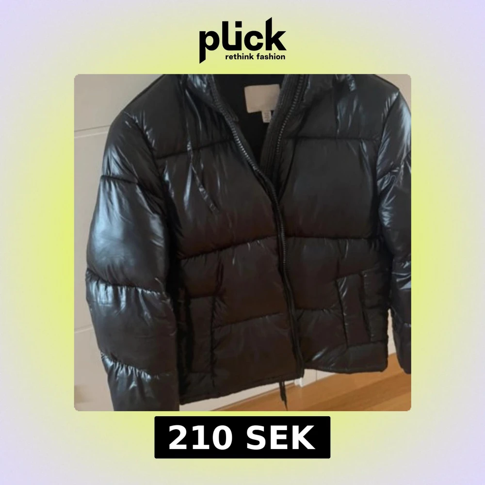 Säljer en svart pufferjacka med glansig yta och vadderade sektioner. Jackan har hög krage, lång ärm och praktisk dragkedja framtill. Perfekt för kalla dagar och har en modern, oversized look.