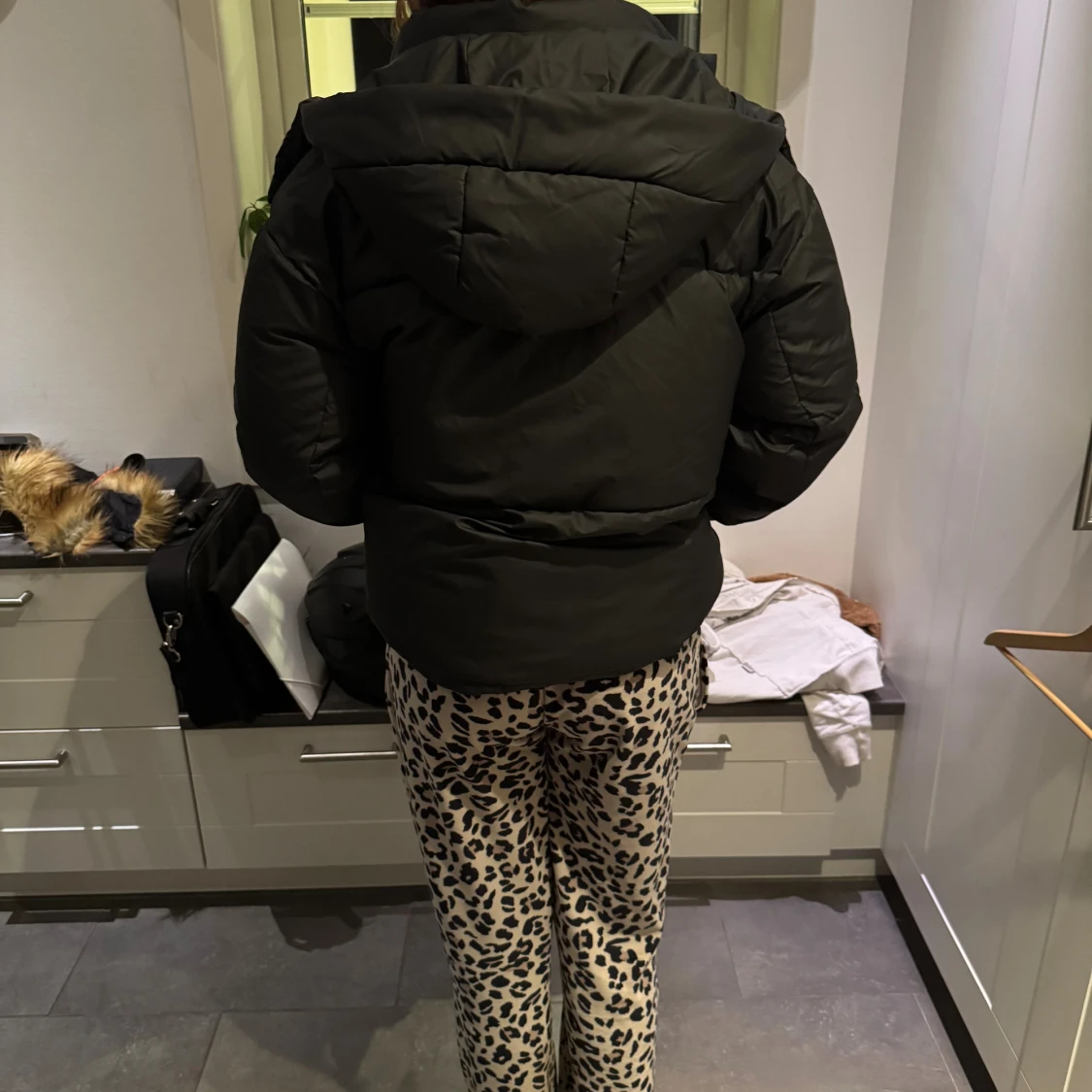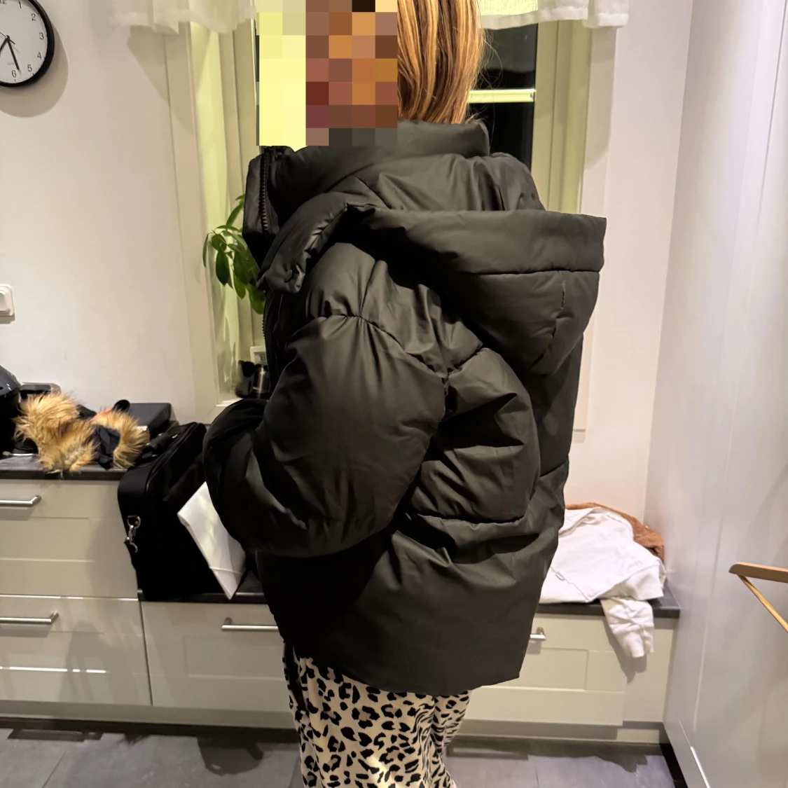 Säljer en svart pufferjacka med stor huva och hög krage. Jackan är vadderad och har en oversized passform som ger en cool och avslappnad look. Perfekt för kalla dagar när du vill hålla dig varm och ändå se snygg ut.