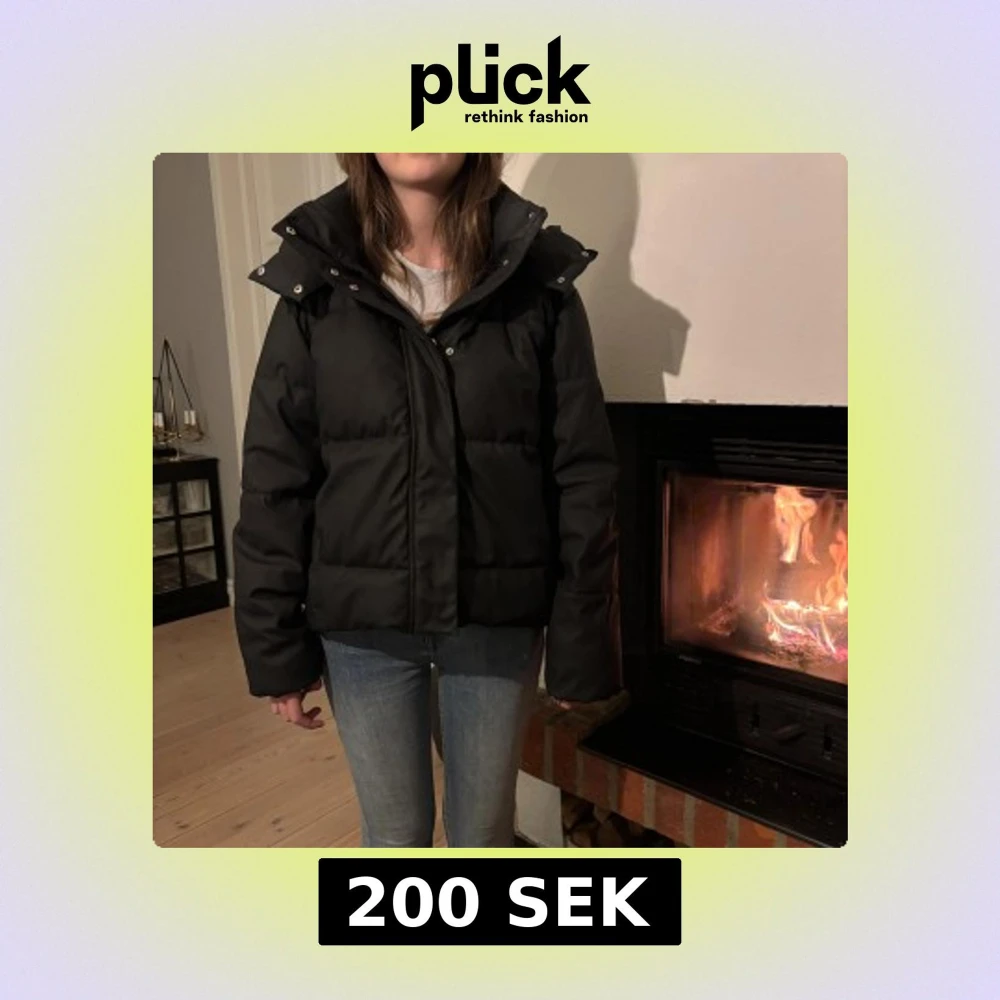 Säljer en svart pufferjacka med stor, mysig huva och breda kanaler. Jackan har dragkedja framtill och knappar vid kragen. Perfekt för kalla dagar och har en loose passform som ger en chill vibe.