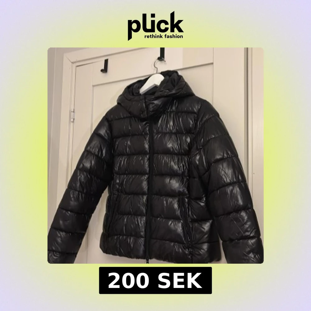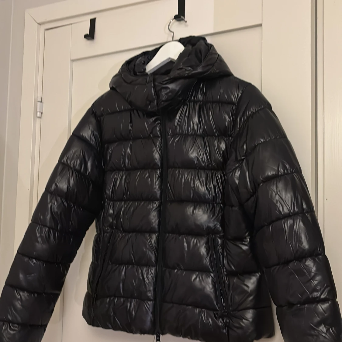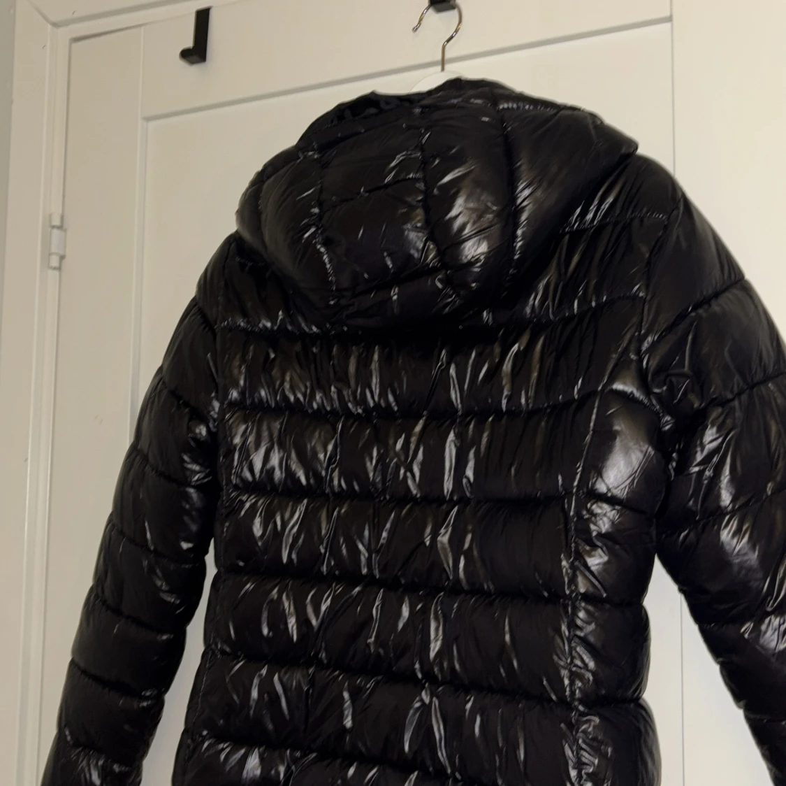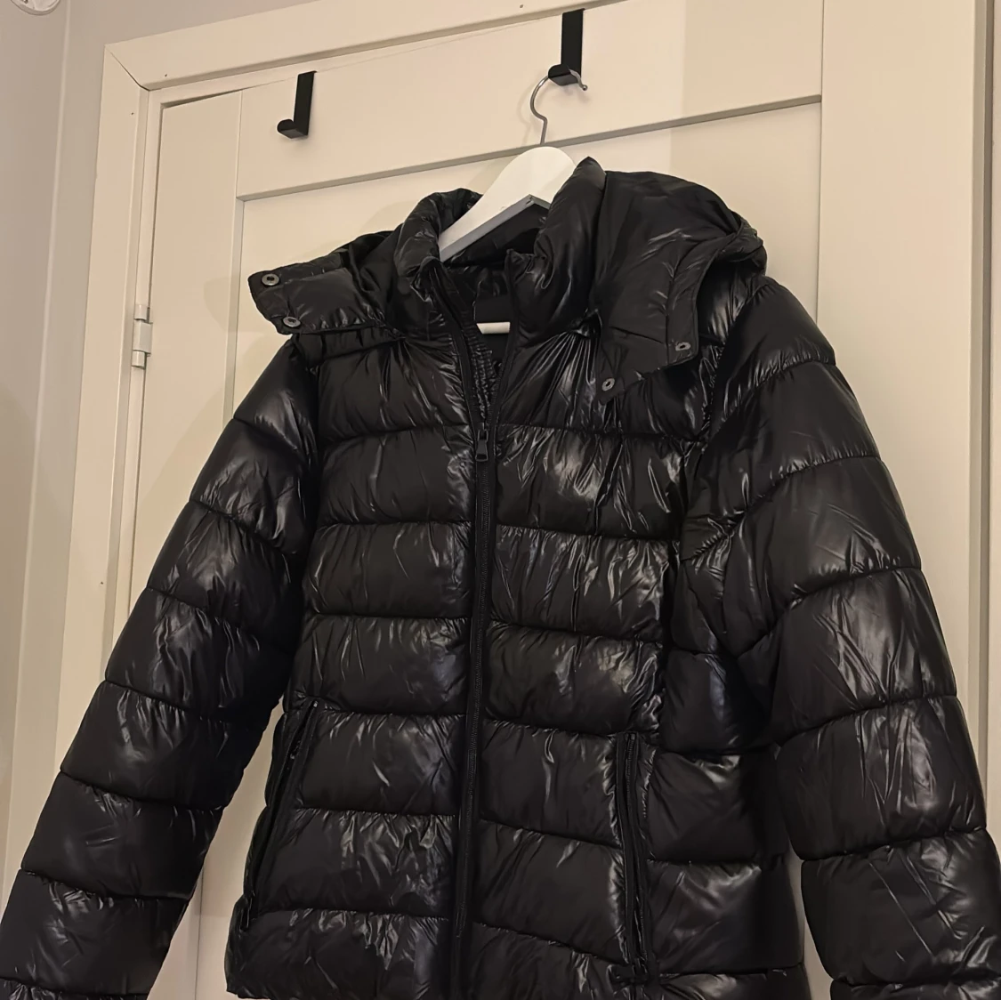 Säljer en svart pufferjacka med huva. Jackan har en glansig yta och dragkedja framtill. Perfekt för kyliga dagar.