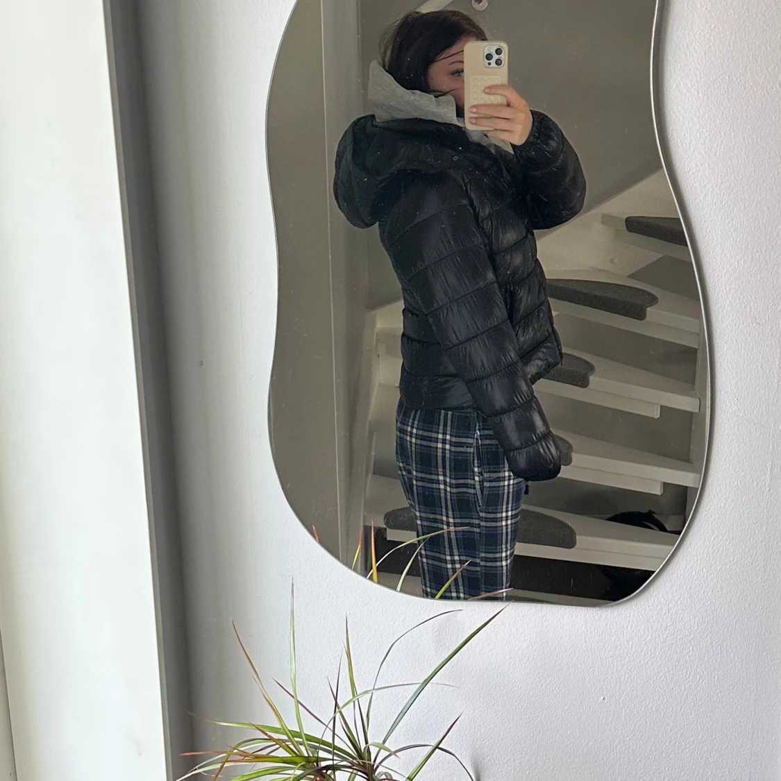 Säljer en svart pufferjacka med huva och dragkedja framtill. Jackan har en quiltad look med breda kanaler och är långärmad. Perfekt för kalla dagar och har en loose passform som ger en chill vibe.