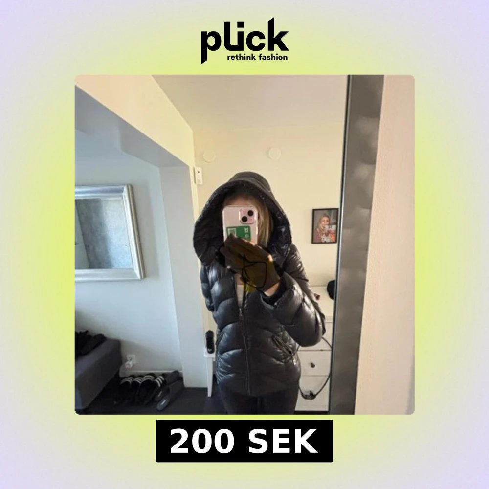 Säljer en svart pufferjacka med stor, mysig huva och dragkedja framtill. Jackan har en glansig yta och två snedställda fickor med dragkedja. Perfekt för kalla dagar när du vill hålla dig varm och ändå se cool ut. I jackan står de att sorleken är xL men de är inte svenska storlekar skulle säga att den sitter som S/M