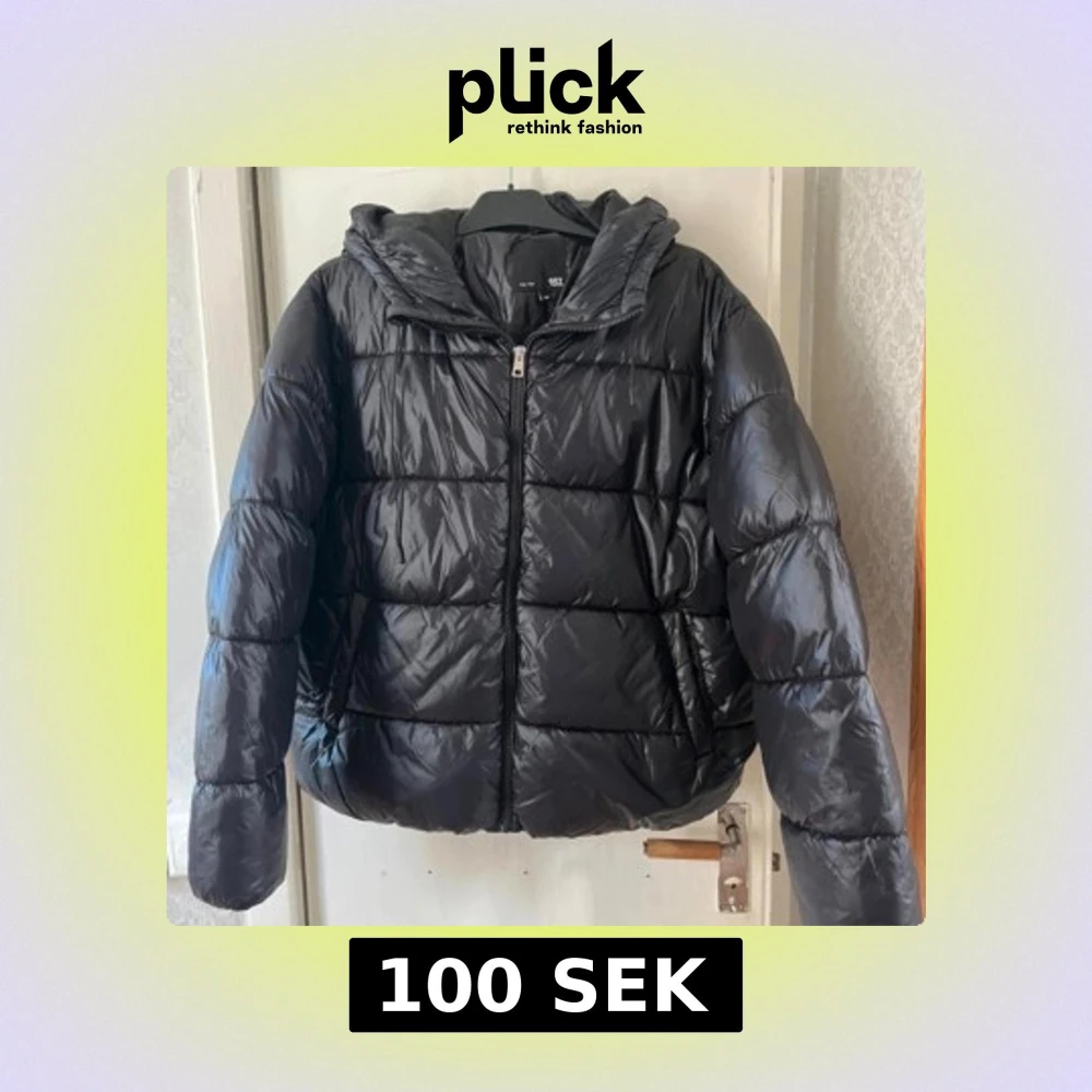 Säljer en svart pufferjacka från lager 157 med huva och dragkedja framtill. Jackan har en quiltad look med breda kanaler och är perfekt för kyliga dagar. Den har lång ärm och en lite glansig finish som ger en modern vibe.