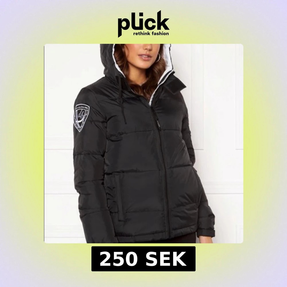 Svart pufferjacka från DBrand med stor huva, dragkedja framtill och röd färg i luvan. Jackan är jätte puffig och perfekt för kalla dagar💗 säljer då jag köpt ny jacka. Skriv för fler bilder eller funderingar💗💗