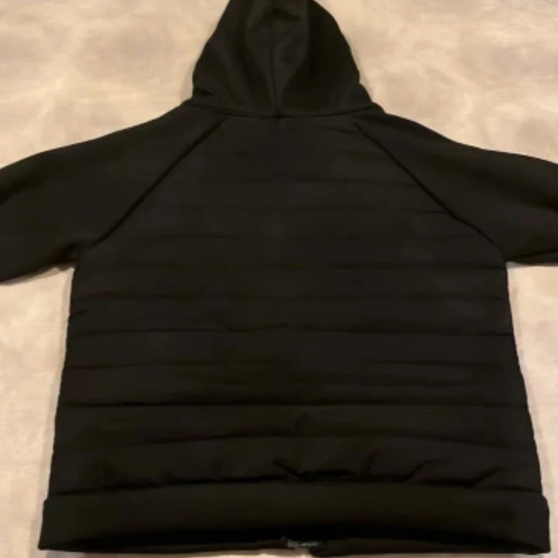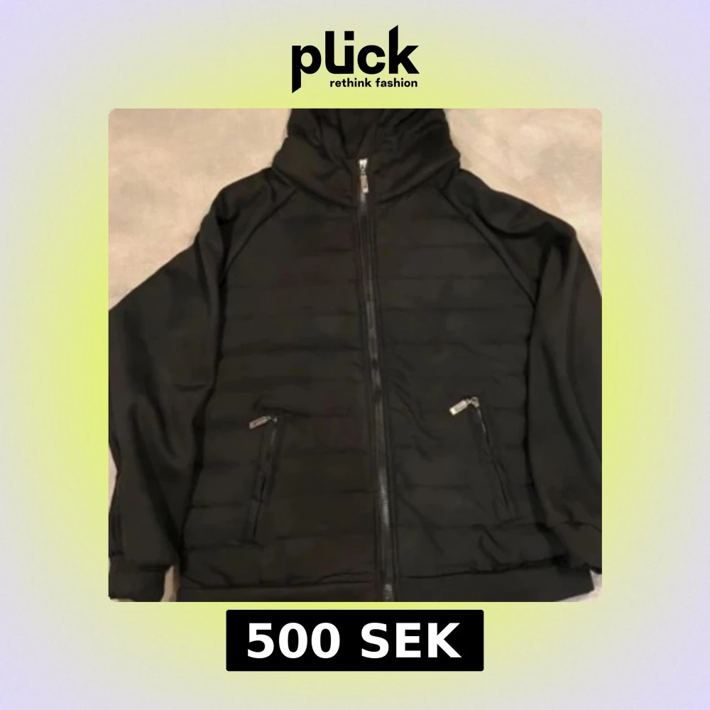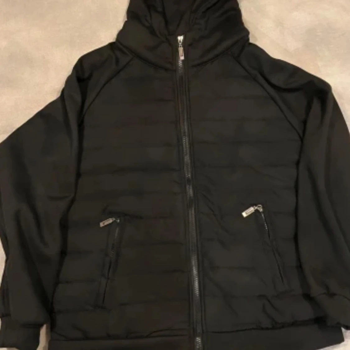 Snygg svart pufferjacka med huva och dragkedja framtill. Jackan har långa ärmar och två praktiska fickor med dragkedjor. Perfekt för kyligare dagar.Aldrig använd och nypris 1000:-