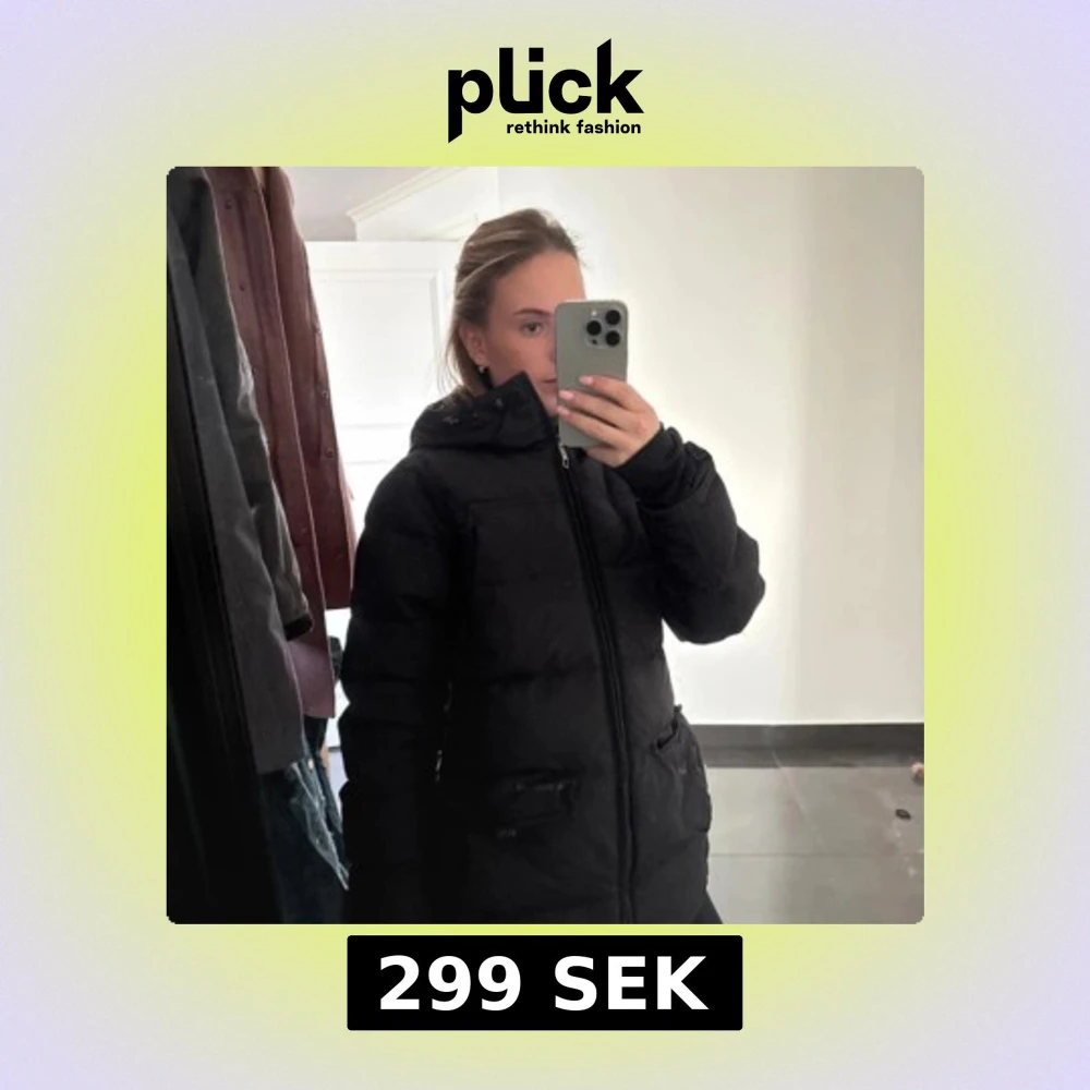 Svart pufferjacka med huva och dragkedja framtill. Jackan har två stora fickor med lock och en enkel, stilren design. Perfekt för kalla dagar och ger en skön, oversized känsla. Passar dig som gillar en klassisk look med streetvibe.