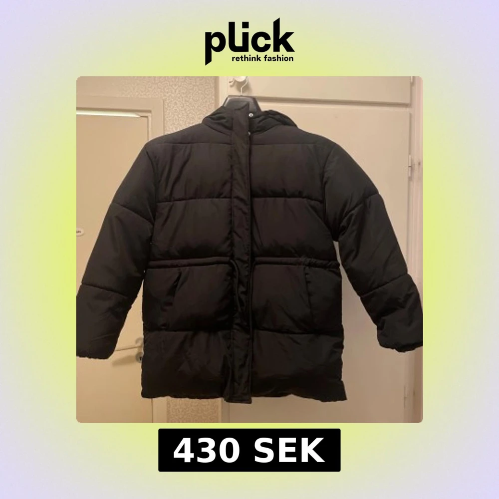 Säljer en svart pufferjacka med huva och stora fickor framtill från H&M. Jackan är lång och stängs med dragkedja samt snören.