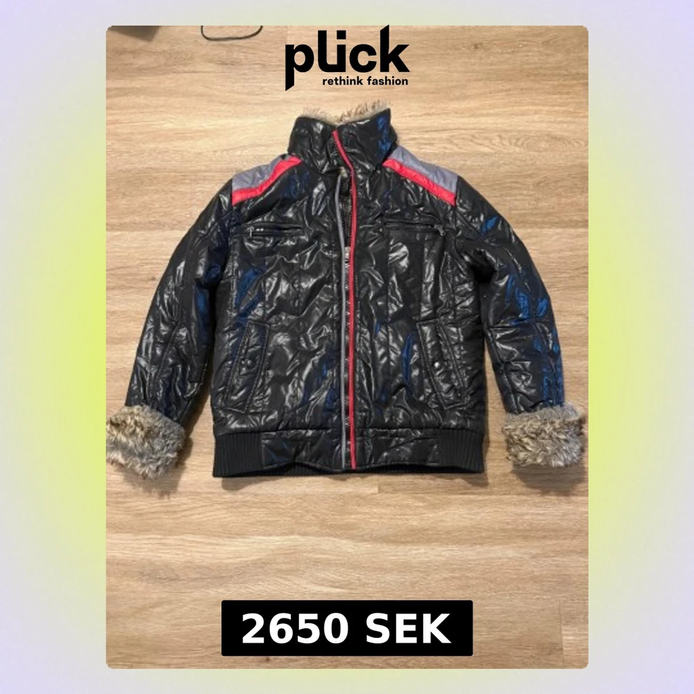 Svart pufferjacka från Mondo Casual med glansig yta, röda och grå detaljer på axlarna och dragkedja framtill. Jackan har fuskpälsfoder och päls vid ärmsluten, samt flera fickor med dragkedja. Perfekt för kalla dagar med sin fluffiga insida.