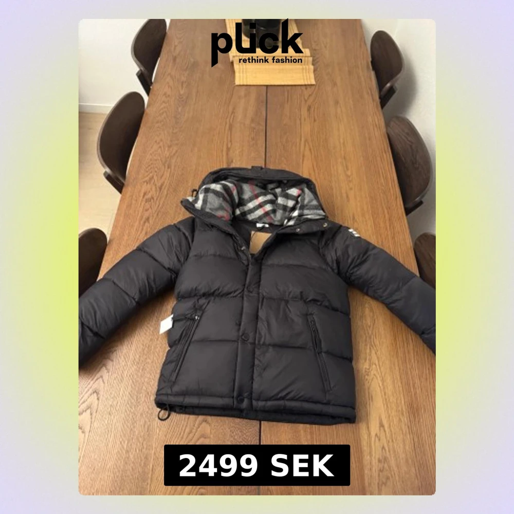 Svart pufferjacka med huva och rutigt foder i grått, vitt och rött. Jackan har dragkedja och knappar framtill samt två sidofickor med dragkedja. Perfekt för kalla dagar och har en modern, boxig passform.
