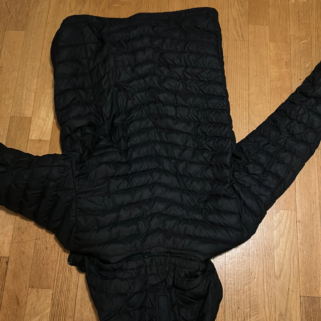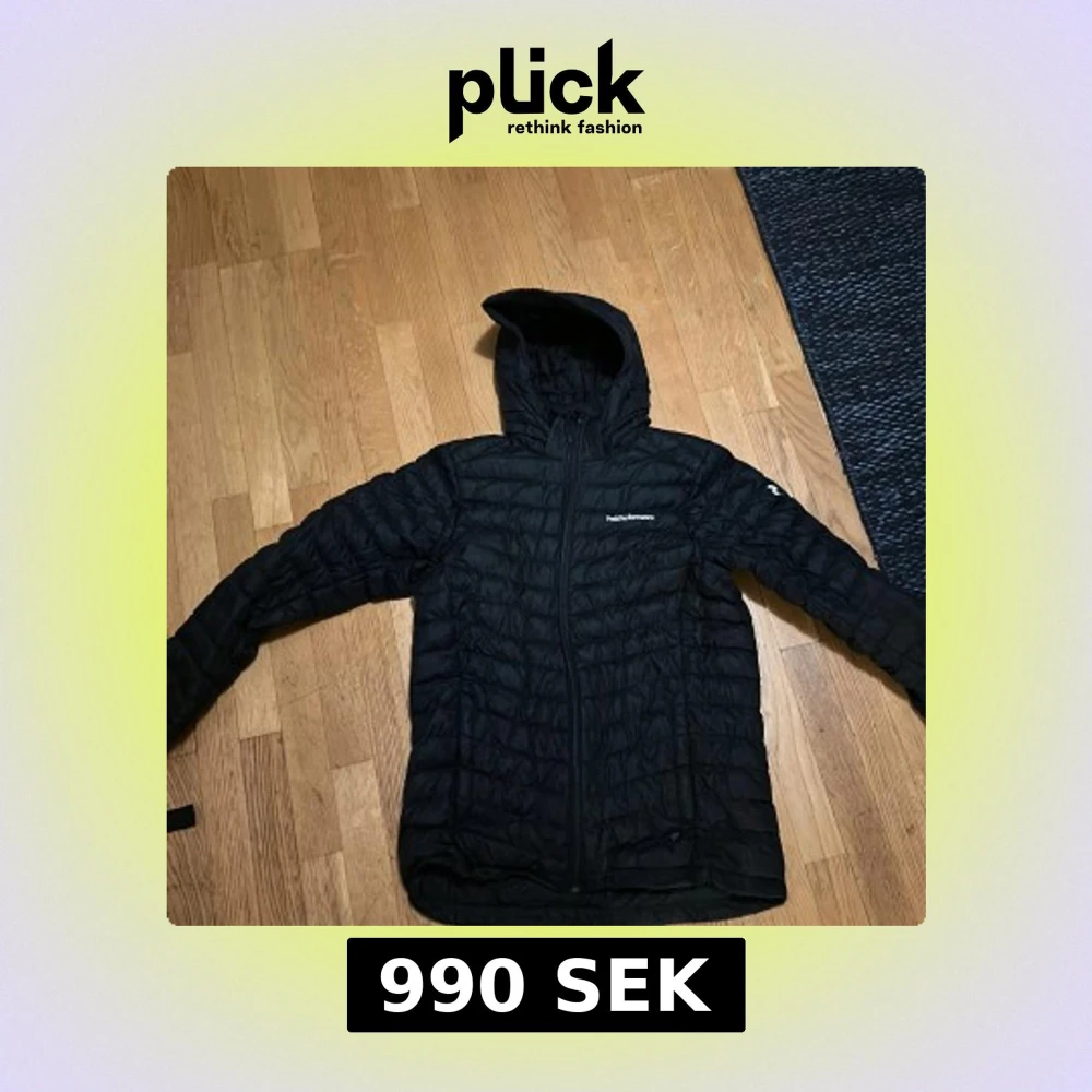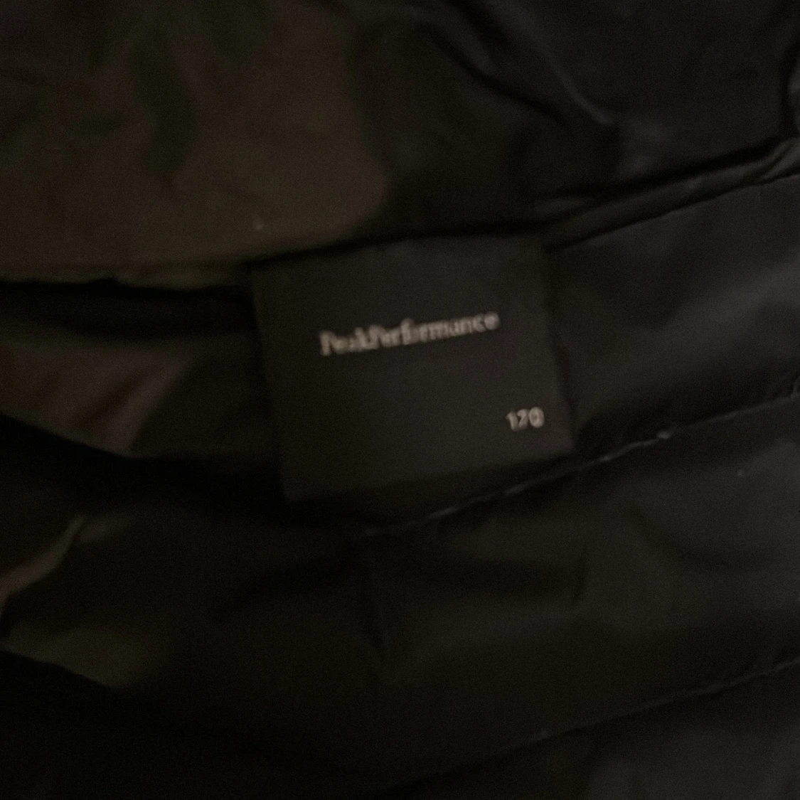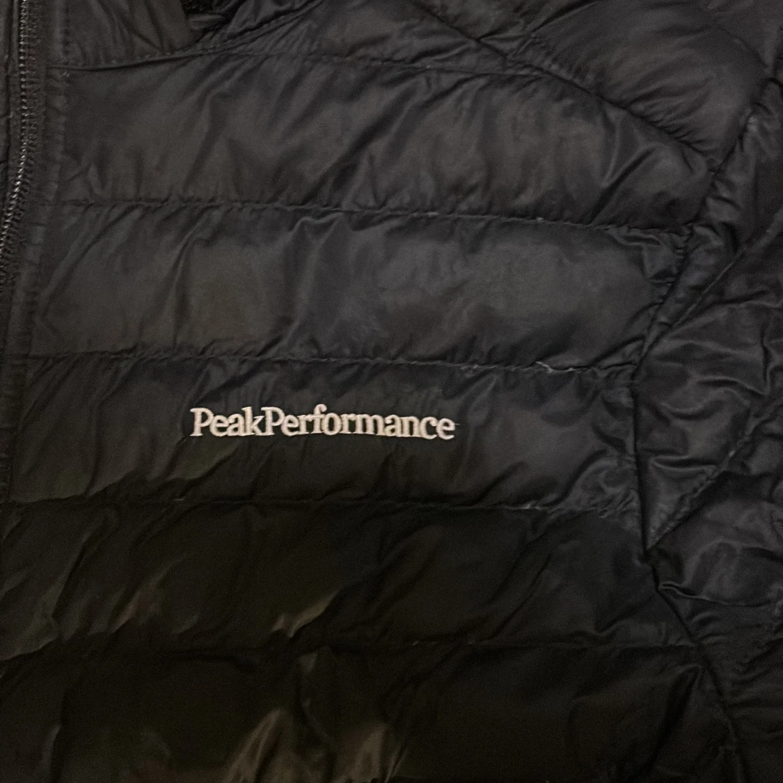 Svart pufferjacka från Peak Performance med huva och dragkedja framtill. Jackan har quiltad design och logga på bröstet samt ärmen. Perfekt för kyliga dagar och enkel att matcha med allt.