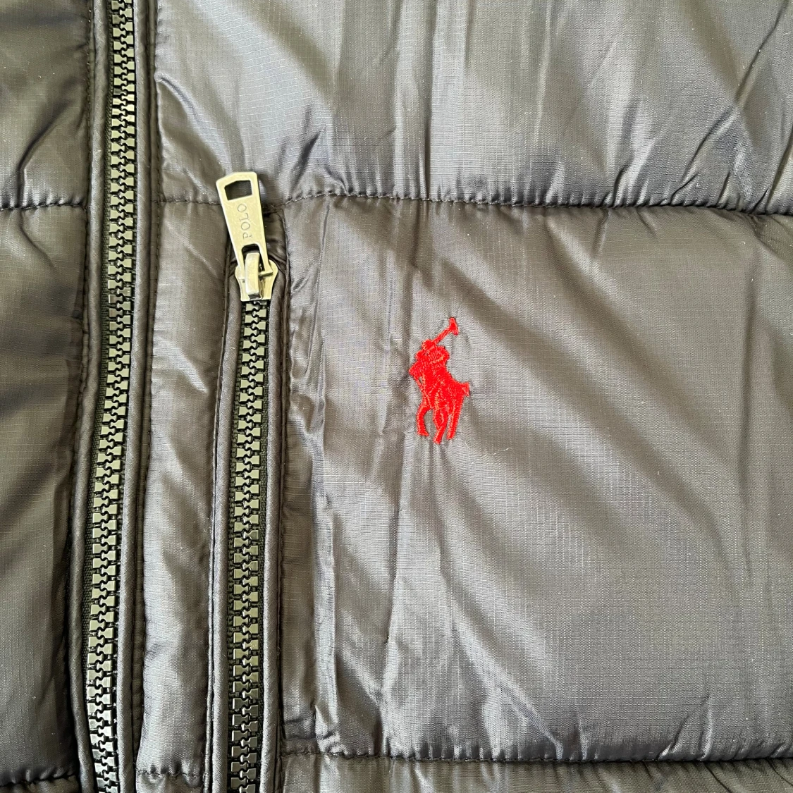 Svart pufferjacka från Polo Ralph Lauren med röd broderad logga på bröstet. Jackan har huva, flera dragkedjor och quiltad design. Perfekt för kalla dagar och har en clean, sportig look.