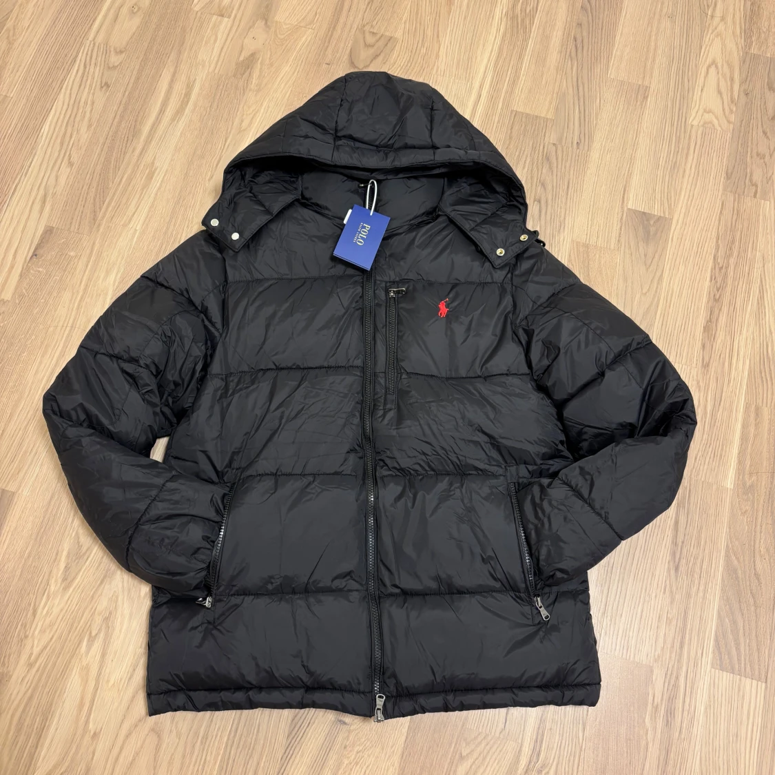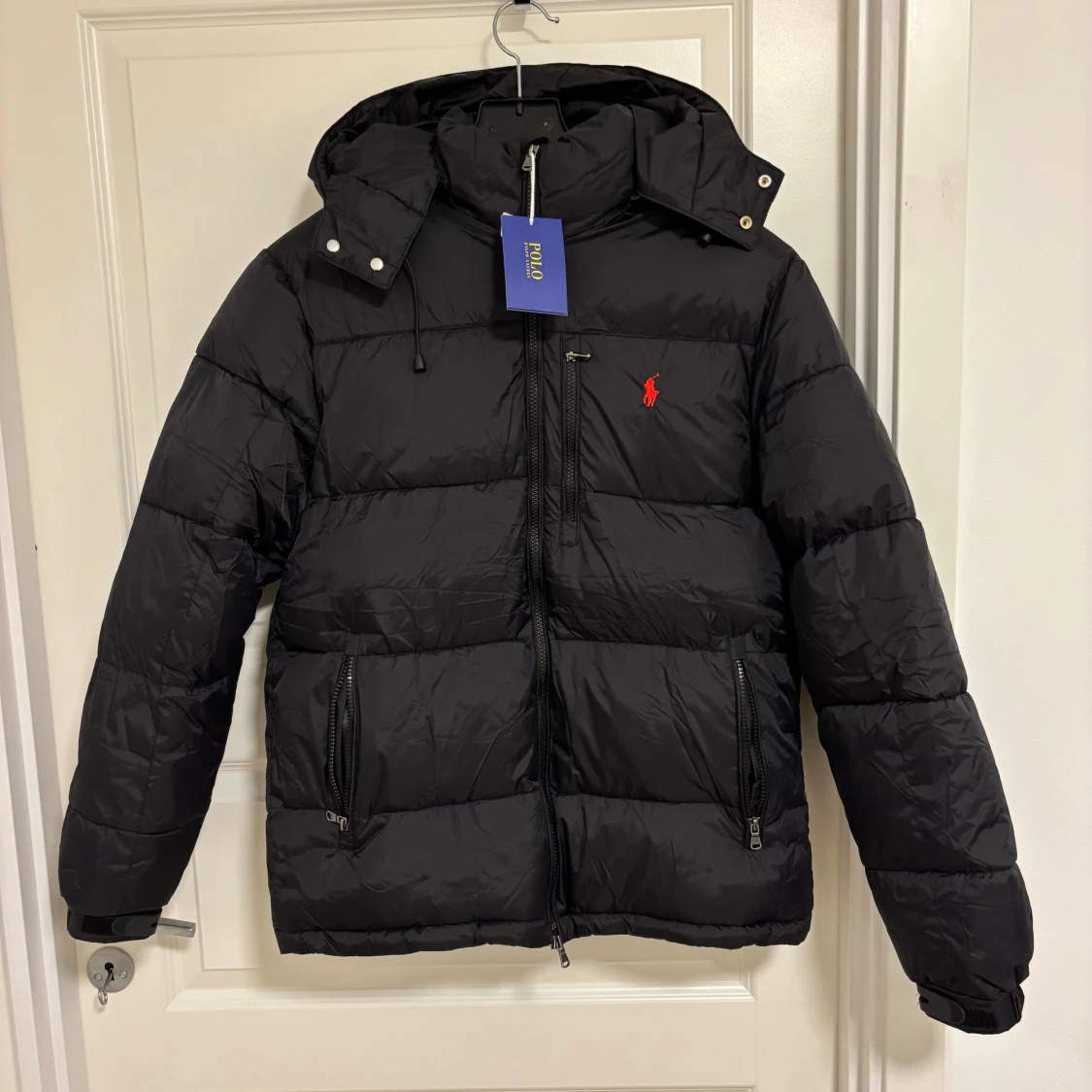 Svart pufferjacka från Polo Ralph Lauren med huva, dragkedjor på fickor och bröstficka samt klassisk röd logga på bröstet. Jackan är vadderad och har justerbara ärmslut. Perfekt för kalla dagar och riktigt snygg streetstil.