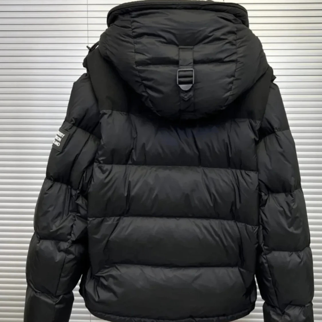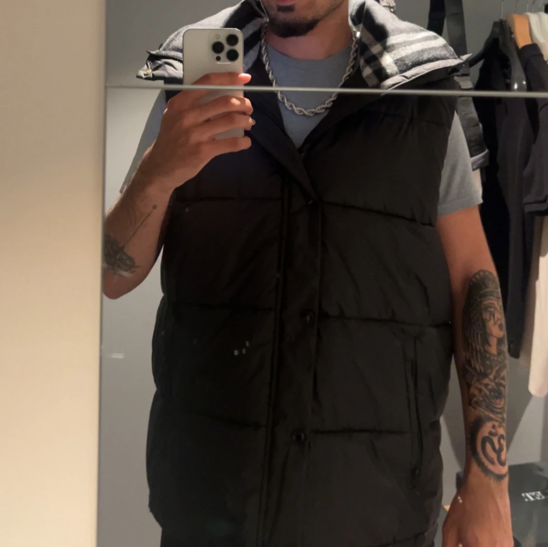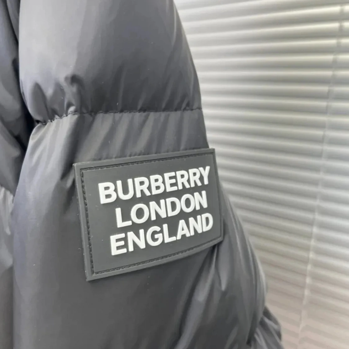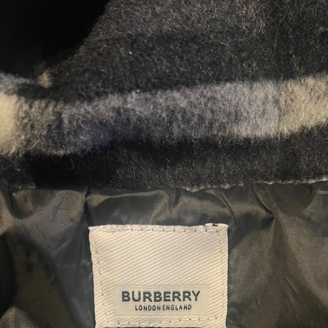 Svart pufferjacka från Burberry går att göra till en väst också, med stor huva och klassiskt rutigt foder. Jackan har dragkedjor på fickorna, tydlig Burberry-patch på ärmen och quiltad design. Perfekt för kalla dagar och riktigt snygg streetstil.