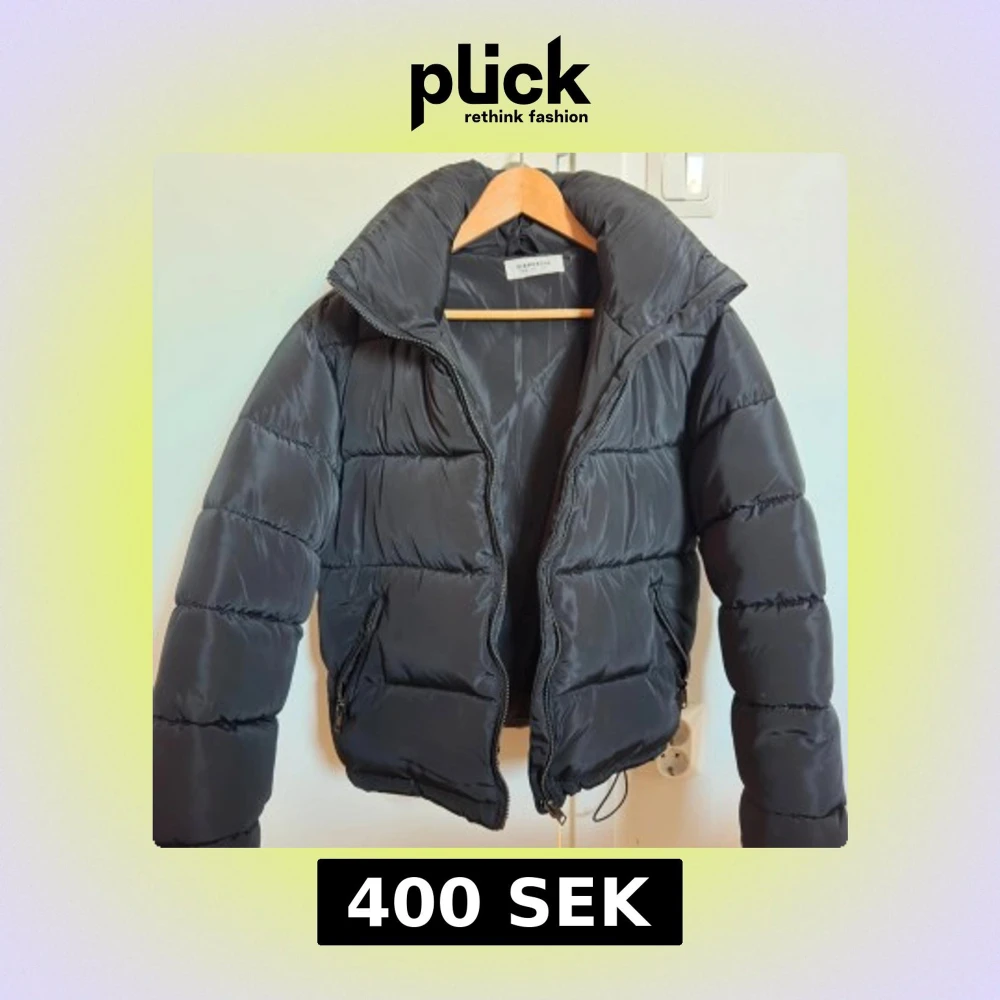 Snygg svart pufferjacka med dragkedja och hög krage. Perfekt för kyliga dagar med sin vadderade design. Jackan har två praktiska fickor med dragkedjor. Storlek 36. Behöver tvättas då det finns lite smink på kragen. Kan skickas om köparen står för frakten.