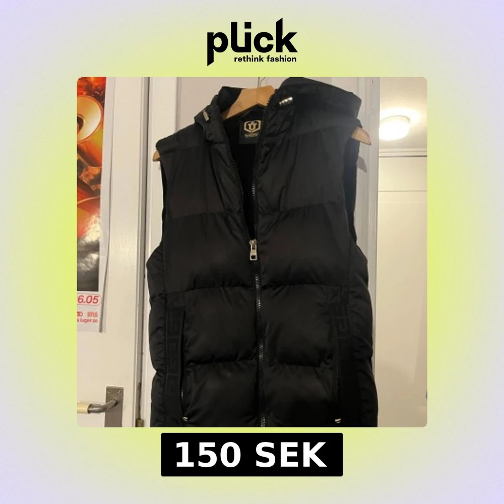 Säljer en svart dunväst/pufferväst från Glorious Gangsta med huva och dragkedja framtill. Västen är quiltad och har två fickor med diskreta detaljer längs sidorna. funkar till många olika stilar.